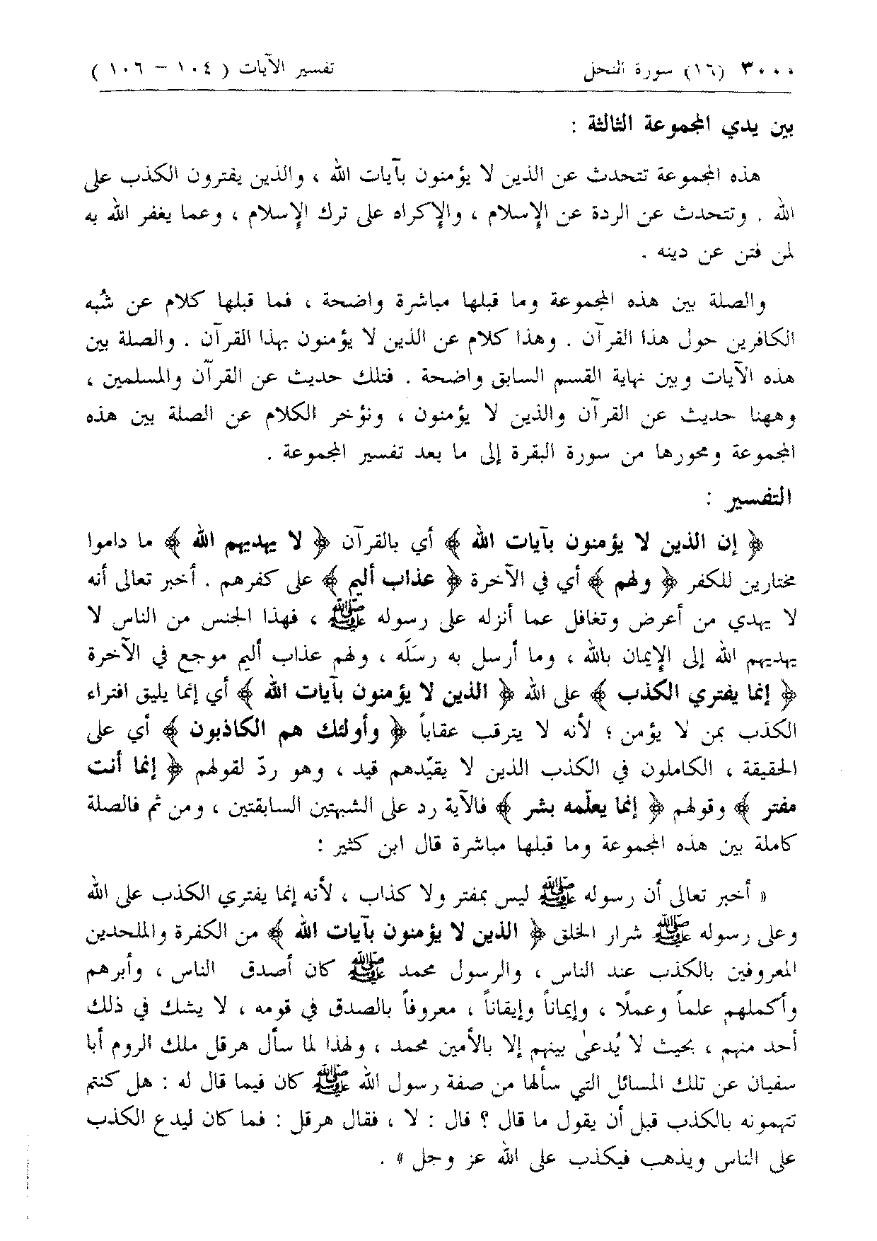 هذه المجموعة تتحدث عن الذين لا يؤمنون بآيات الله، والذين يفترون الكذب على الله. وتتحدث عن الردة عن الإسلام، والإكراه على ترك الإسلام، وعما يغفر الله به لمن فتن عن دينه.