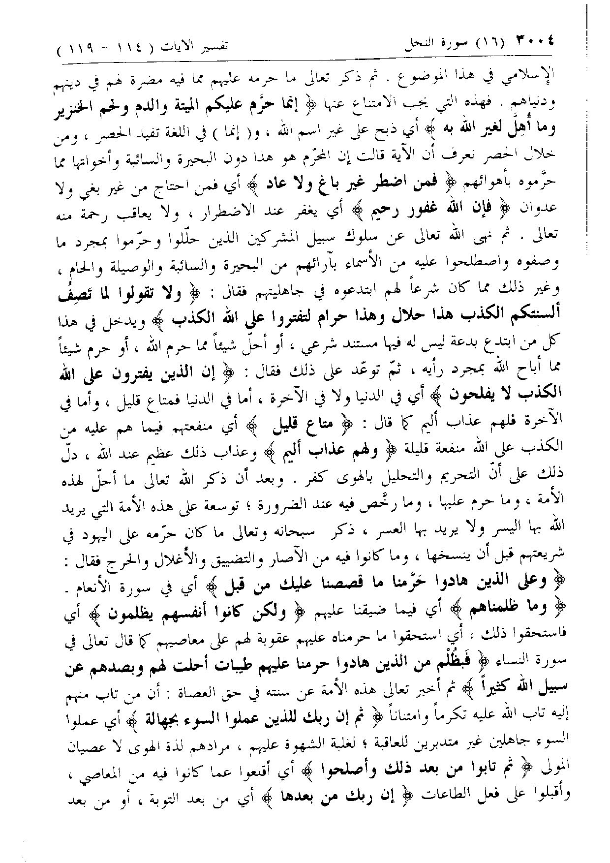 ثم نهى الله تعالى عن سلوك سبيل المشركين الذين حلّلوا وحرّموا بمجرد ما وصفوه واصطلحوا عليه من الأسماء بآرائهم من البحيرة والسائبة والوصيلة والحام، وغير ذلك مما كان شرعا لهم ابتدعوه في جاهليتهم فقال: وَلا تَقُولُوا لِما تَصِفُ أَلْسِنَتُكُمُ الْكَذِبَ هذا حَلالٌ وَهذا حَرامٌ لِتَفْتَرُوا عَلَى اللَّهِ الْكَذِبَ ويدخل في هذا كل من ابتدع بدعة ليس له فيها مستند شرعي، أو أحلّ شيئا مما حرم الله، أو حرم شيئا مما أباح الله بمجرد رأيه، ثمّ توعّد على ذلك فقال: إِنَّ الَّذِينَ يَفْتَرُونَ عَلَى اللَّهِ الْكَذِبَ لا يُفْلِحُونَ أي في الدنيا ولا في الآخرة، أما في الدنيا فمتاع قليل، وأما في الآخرة فلهم عذاب أليم كما قال: