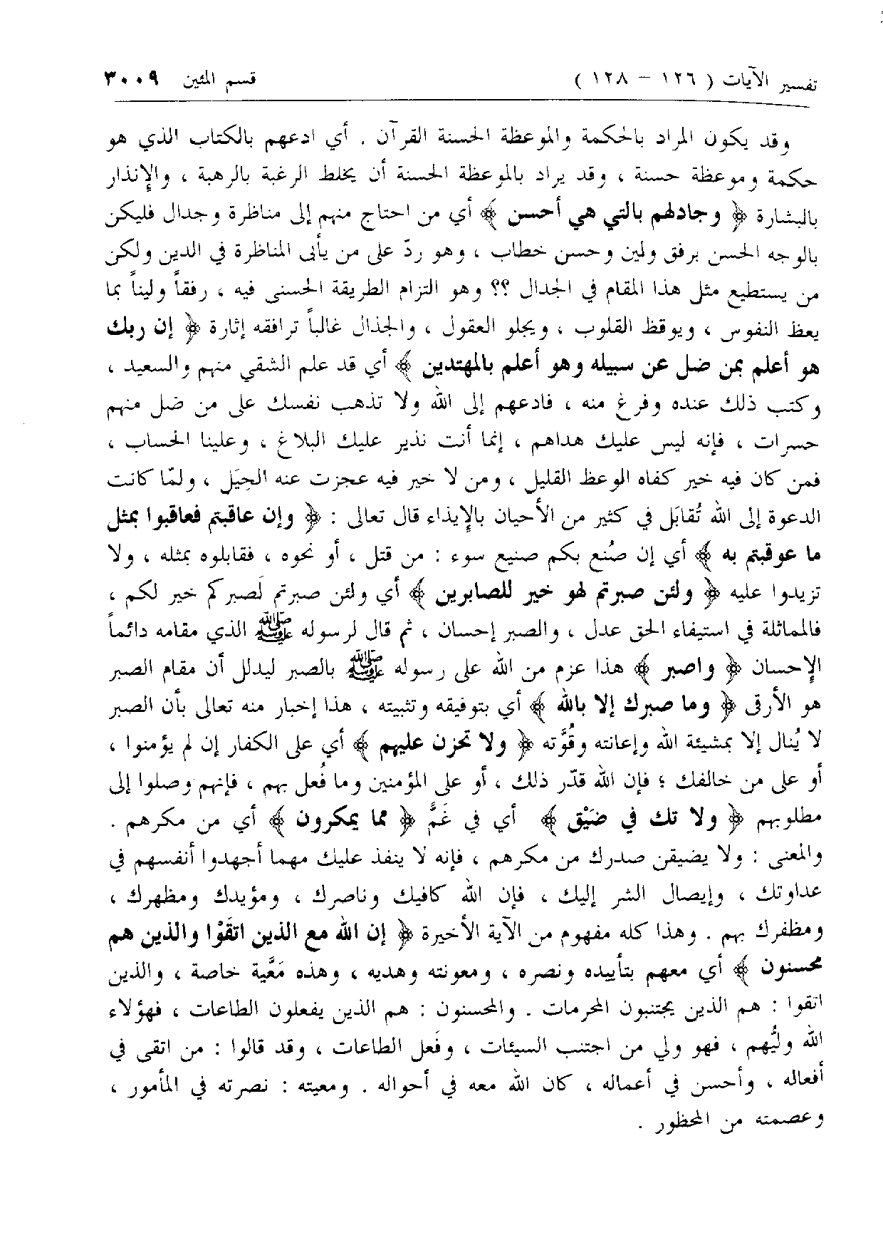 وقد يكون المراد بالحكمة والموعظة الحسنة القرآن. أي ادعهم بالكتاب الذي هو حكمة وموعظة حسنة، وقد يراد بالموعظة الحسنة أن يخلط الرغبة بالرهبة، والإنذار بالبشارة وَجادِلْهُمْ بِالَّتِي هِيَ أَحْسَنُ أي من احتاج منهم إلى مناظرة وجدال فليكن بالوجه الحسن برفق ولين وحسن خطاب، وهو ردّ على من يأبى المناظرة في الدين ولكن من يستطيع مثل هذا المقام في الجدال؟؟ وهو التزام الطريقة الحسنى فيه، رفقا ولينا بما يعظ النفوس، ويوقظ القلوب، ويجلو العقول، والجدال غالبا ترافقه إثارة إِنَّ رَبَّكَ هُوَ أَعْلَمُ بِمَنْ ضَلَّ عَنْ سَبِيلِهِ وَهُوَ أَعْلَمُ بِالْمُهْتَدِينَ أي قد علم الشقي منهم والسعيد، وكتب ذلك عنده وفرغ منه، فادعهم إلى الله ولا تذهب نفسك على من ضل منهم حسرات، فإنه ليس عليك هداهم، إنما أنت نذير عليك البلاغ، وعلينا الحساب، فمن كان فيه خير كفاه الوعظ القليل، ومن لا خير فيه عجزت عنه الحيل، ولمّا كانت الدعوة إلى الله تقابل في كثير من الأحيان بالإيذاء قال تعالى: