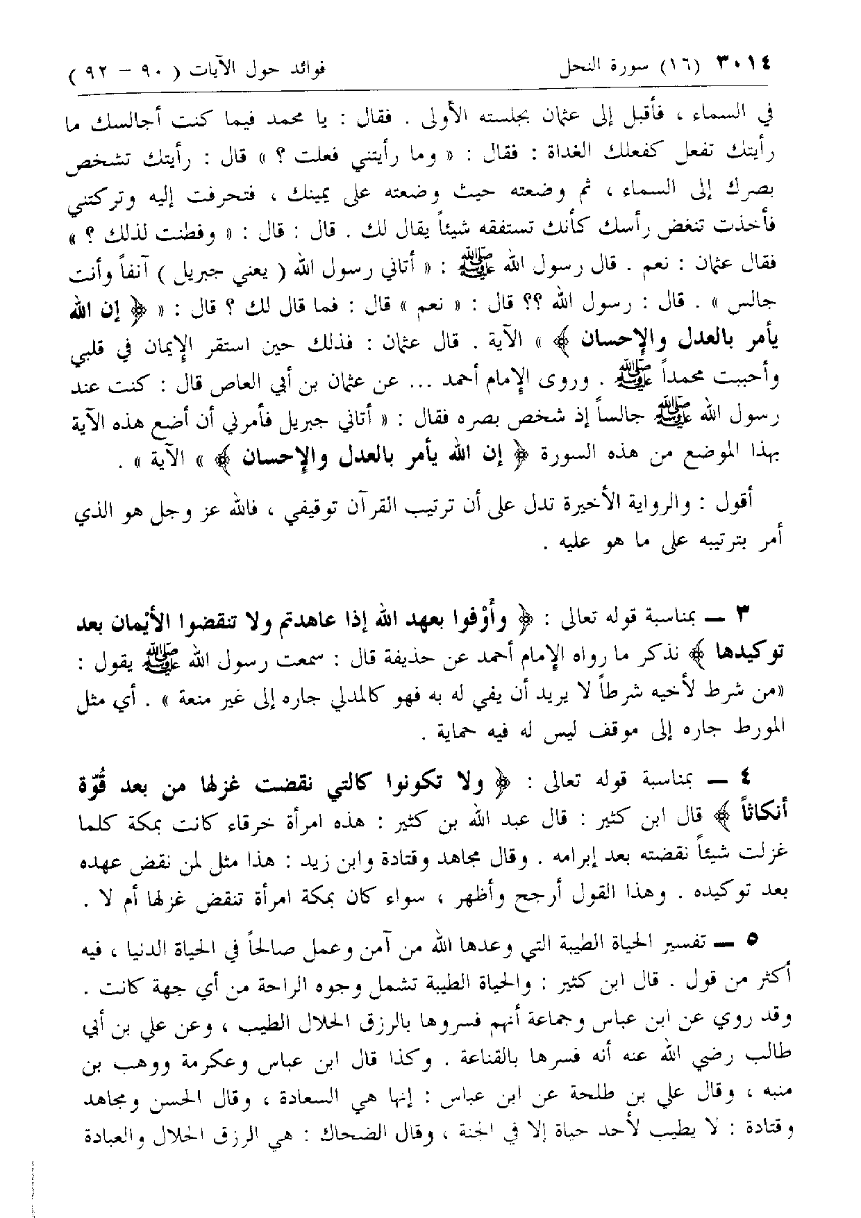 في السماء، فأقبل إلى عثمان بجلسته الاولى. فقال: يا محمد فيما كنت أجالسك ما رأيتك تفعل كفعلك الغداة: فقال: «وما رأيتني فعلت؟» قال: رأيتك تشخص بصرك إلى السماء، ثم وضعته حيث وضعته على يمينك، فتحرفت إليه وتركتني فأخذت تنغض رأسك كأنك تستفقه شيئا يقال لك. قال: قال: «وفطنت لذلك؟» فقال عثمان: نعم. قال رسول الله صلّى الله عليه وسلّم: «أتاني رسول الله (يعني جبريل) آنفا وأنت جالس». قال: رسول الله؟؟ قال: «نعم» قال: فما قال لك؟ قال: «إِنَّ اللَّهَ يَأْمُرُ بِالْعَدْلِ وَالْإِحْسانِ» الآية. قال عثمان: فذلك حين استقر الإيمان في قلبي وأحببت محمدا صلّى الله عليه وسلّم. وروى الإمام أحمد ... عن عثمان بن أبي العاص قال: كنت عند رسول الله صلّى الله عليه وسلّم جالسا إذ شخص بصره فقال: «أتاني جبريل فأمرني أن أضع هذه الآية بهذا الموضع من هذه السورة إِنَّ اللَّهَ يَأْمُرُ بِالْعَدْلِ وَالْإِحْسانِ» الآية».