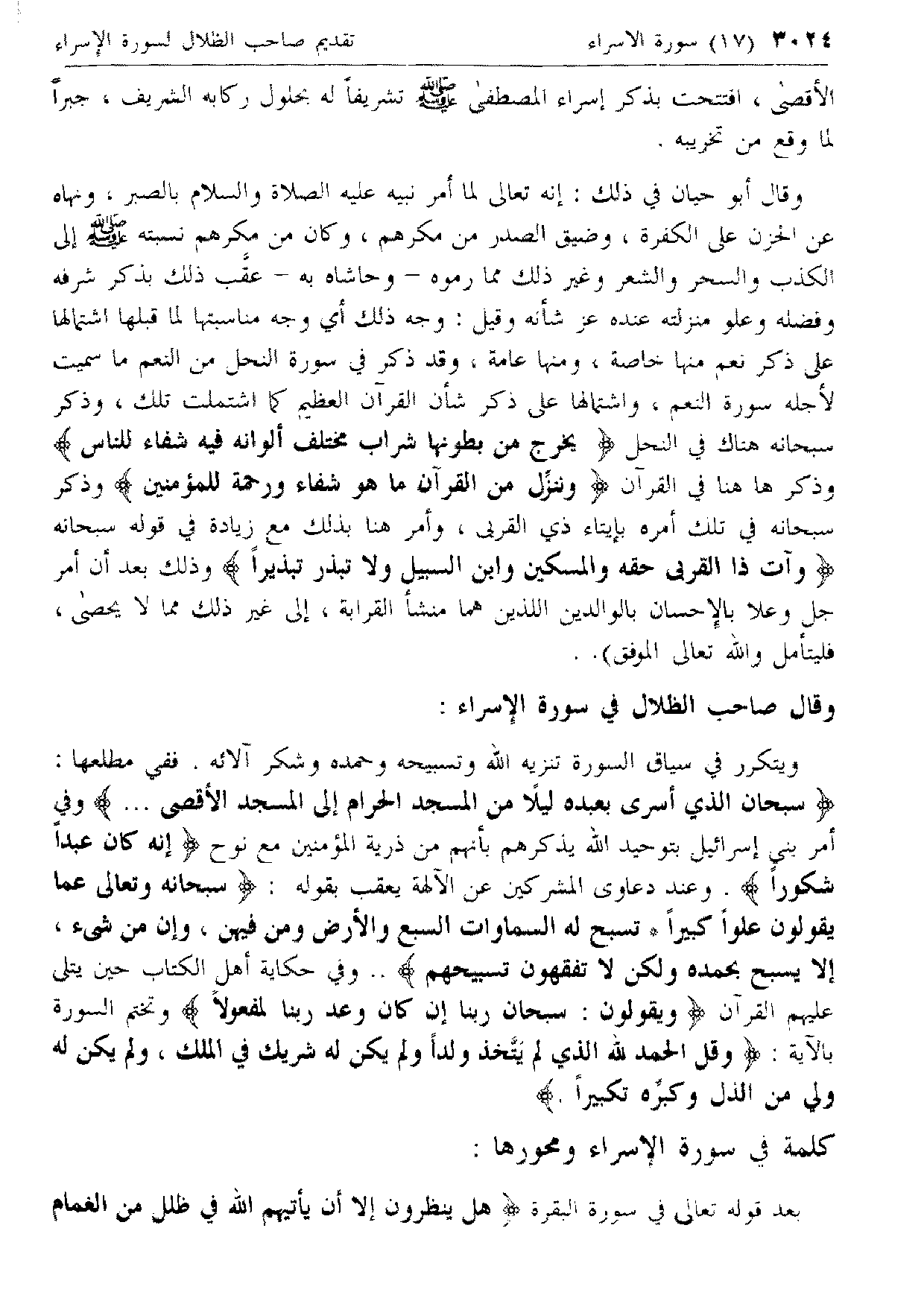 سُبْحانَ الَّذِي أَسْرى بِعَبْدِهِ لَيْلًا مِنَ الْمَسْجِدِ الْحَرامِ إِلَى الْمَسْجِدِ الْأَقْصَى ... وفي أمر بني إسرائيل بتوحيد الله يذكرهم بأنهم من ذرية المؤمنين مع نوح إِنَّهُ كانَ عَبْداً شَكُوراً. وعند دعاوى المشركين عن الآلهة يعقب بقوله: سُبْحانَهُ وَتَعالى عَمَّا يَقُولُونَ عُلُوًّا كَبِيراً* تُسَبِّحُ لَهُ السَّماواتُ السَّبْعُ وَالْأَرْضُ وَمَنْ فِيهِنَّ، وَإِنْ مِنْ شَيْءٍ، إِلَّا يُسَبِّحُ بِحَمْدِهِ وَلكِنْ لا تَفْقَهُونَ تَسْبِيحَهُمْ .. وفي حكاية أهل الكتاب حين يتلى عليهم القرآن وَيَقُولُونَ: سُبْحانَ رَبِّنا إِنْ كانَ وَعْدُ رَبِّنا لَمَفْعُولًا وتختم السورة بالآية: وَقُلِ الْحَمْدُ لِلَّهِ الَّذِي لَمْ يَتَّخِذْ وَلَداً وَلَمْ يَكُنْ لَهُ شَرِيكٌ فِي الْمُلْكِ، وَلَمْ يَكُنْ لَهُ وَلِيٌّ مِنَ الذُّلِّ وَكَبِّرْهُ تَكْبِيراً.