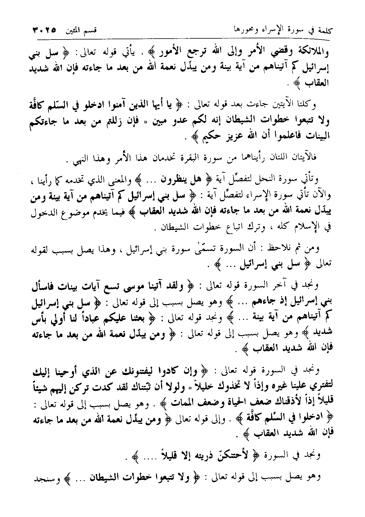 وتأتي سورة النحل لتفصّل آية هَلْ يَنْظُرُونَ ... * والمعنى الذي تخدمه كما رأينا، والآن تأتي سورة الإسراء لتفصّل آية: سَلْ بَنِي إِسْرائِيلَ كَمْ آتَيْناهُمْ مِنْ آيَةٍ بَيِّنَةٍ وَمَنْ يُبَدِّلْ نِعْمَةَ اللَّهِ مِنْ بَعْدِ ما جاءَتْهُ فَإِنَّ اللَّهَ شَدِيدُ الْعِقابِ فيما يخدم موضوع الدخول في الإسلام كله، وترك اتباع خطوات الشيطان.