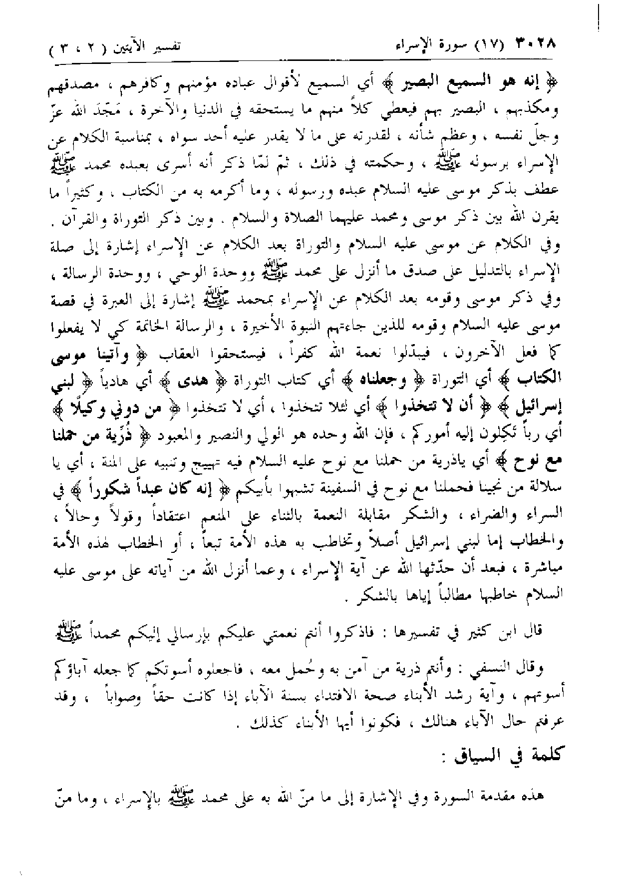 ذُرِّيَّةَ مَنْ حَمَلْنا مَعَ نُوحٍ أي يا ذرية من حملنا مع نوح عليه السلام فيه تهييج وتنبيه على المنة، أي يا سلالة من نجينا فحملنا مع نوح في السفينة تشبهوا بأبيكم إِنَّهُ كانَ عَبْداً شَكُوراً في السراء والضراء، والشكر مقابلة النعمة بالثناء على المنعم اعتقادا وقولا وحالا، والخطاب إما لبني إسرائيل أصلا وتخاطب به هذه الأمة تبعا، أو الخطاب لهذه الأمة مباشرة، فبعد أن حدّثها الله عن آية الإسراء، وعما أنزل الله من آياته على موسى عليه السلام خاطبها مطالبا إياها بالشكر.