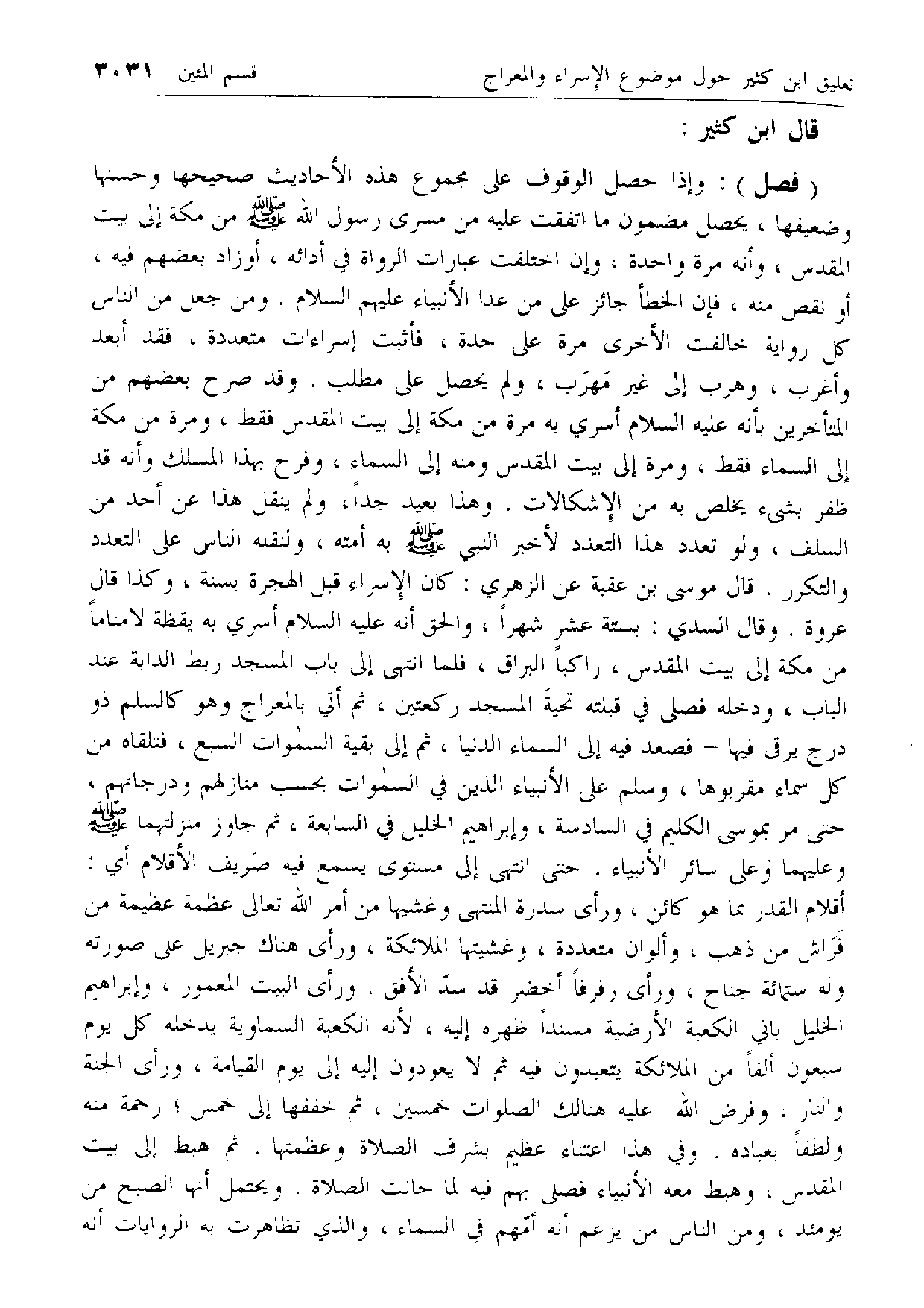وإذا حصل الوقوف على مجموع هذه الأحاديث صحيحها وحسنها وضعيفها، يحصل مضمون ما اتفقت عليه من مسرى رسول الله صلّى الله عليه وسلّم من مكة إلى بيت المقدس، وأنه مرة واحدة، وإن اختلفت عبارات الرواة في أدائه، أو زاد بعضهم فيه، أو نقص منه، فإن الخطأ جائز على من عدا الأنبياء عليهم السلام. ومن جعل من الناس كل رواية خالفت الأخرى مرة على حدة، فأثبت إسراءات متعددة، فقد أبعد وأغرب، وهرب إلى غير مهرب، ولم يحصل على مطلب. وقد صرح بعضهم من المتأخرين بأنه عليه السلام أسري به مرة من مكة إلى بيت المقدس فقط، ومرة من مكة إلى السماء فقط، ومرة إلى بيت المقدس ومنه إلى السماء، وفرح بهذا المسلك وأنه قد ظفر بشيء يخلص به من الإشكالات. وهذا بعيد جدا، ولم ينقل هذا عن أحد من السلف، ولو تعدد هذا التعدد لأخبر النبي صلّى الله عليه وسلّم به أمته، ولنقله الناس على التعدد والتكرر. قال موسى بن عقبة عن الزهري: كان الإسراء قبل الهجرة بسنة، وكذا قال عروة. وقال السدي: بستة عشر شهرا، والحق أنه عليه السلام أسري به يقظة لا مناما من مكة إلى بيت المقدس، راكبا البراق، فلما انتهى إلى باب المسجد ربط الدابة عند الباب، ودخله فصلى في قبلته تحية المسجد ركعتين، ثم أتي بالمعراج وهو كالسلم ذو درج يرقى فيها- فصعد فيه إلى السماء الدنيا، ثم إلى بقية السموات السبع، فتلقاه من كل سماء مقربوها، وسلم على الأنبياء الذين في السموات بحسب منازلهم ودرجاتهم، حتى مر بموسى الكليم في السادسة، وإبراهيم الخليل في السابعة، ثم جاوز منزلتهما صلّى الله عليه وسلّم وعليهما وعلى سائر الأنبياء. حتى انتهى إلى مستوى يسمع فيه صريف الأقلام أي: