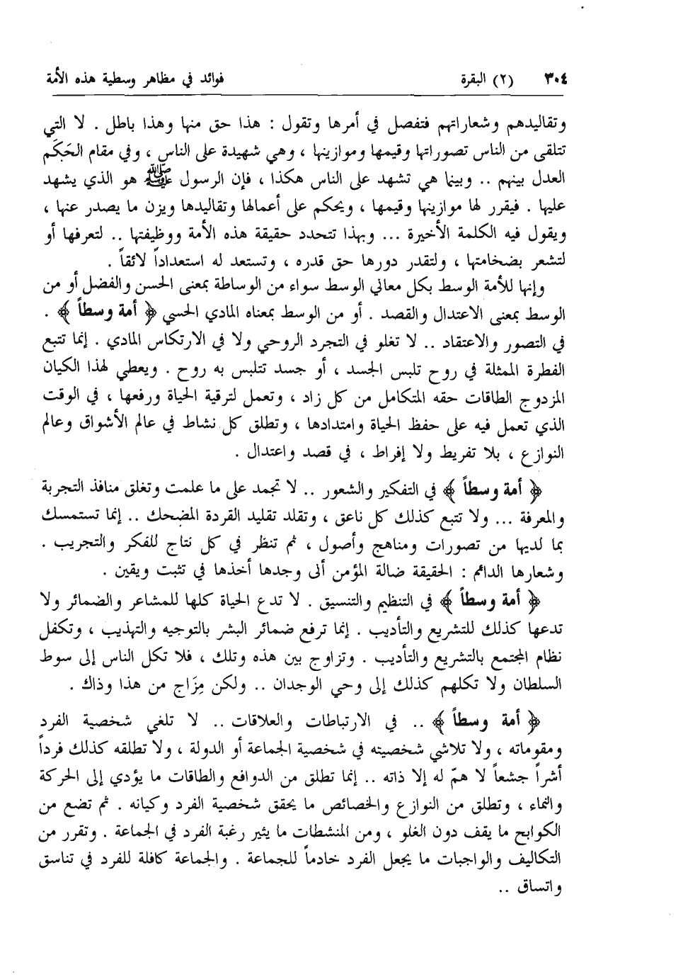أُمَّةً وَسَطاً .. في الارتباطات والعلاقات .. لا تلغي شخصية الفرد ومقوماته، ولا تلاشي شخصيته في شخصية الجماعة أو الدولة، ولا تطلقه كذلك فردا أشرا جشعا لا هم له إلا ذاته .. إنما تطلق من الدوافع والطاقات ما يؤدي إلى الحركة والنماء، وتطلق من النوازع والخصائص ما يحقق شخصية الفرد وكيانه. ثم تضع من الكوابح ما يقف دون الغلو، ومن المنشطات ما يثير رغبة الفرد في الجماعة. وتقرر من التكاليف والواجبات ما يجعل الفرد خادما للجماعة. والجماعة كافلة للفرد في تناسق واتساق ..