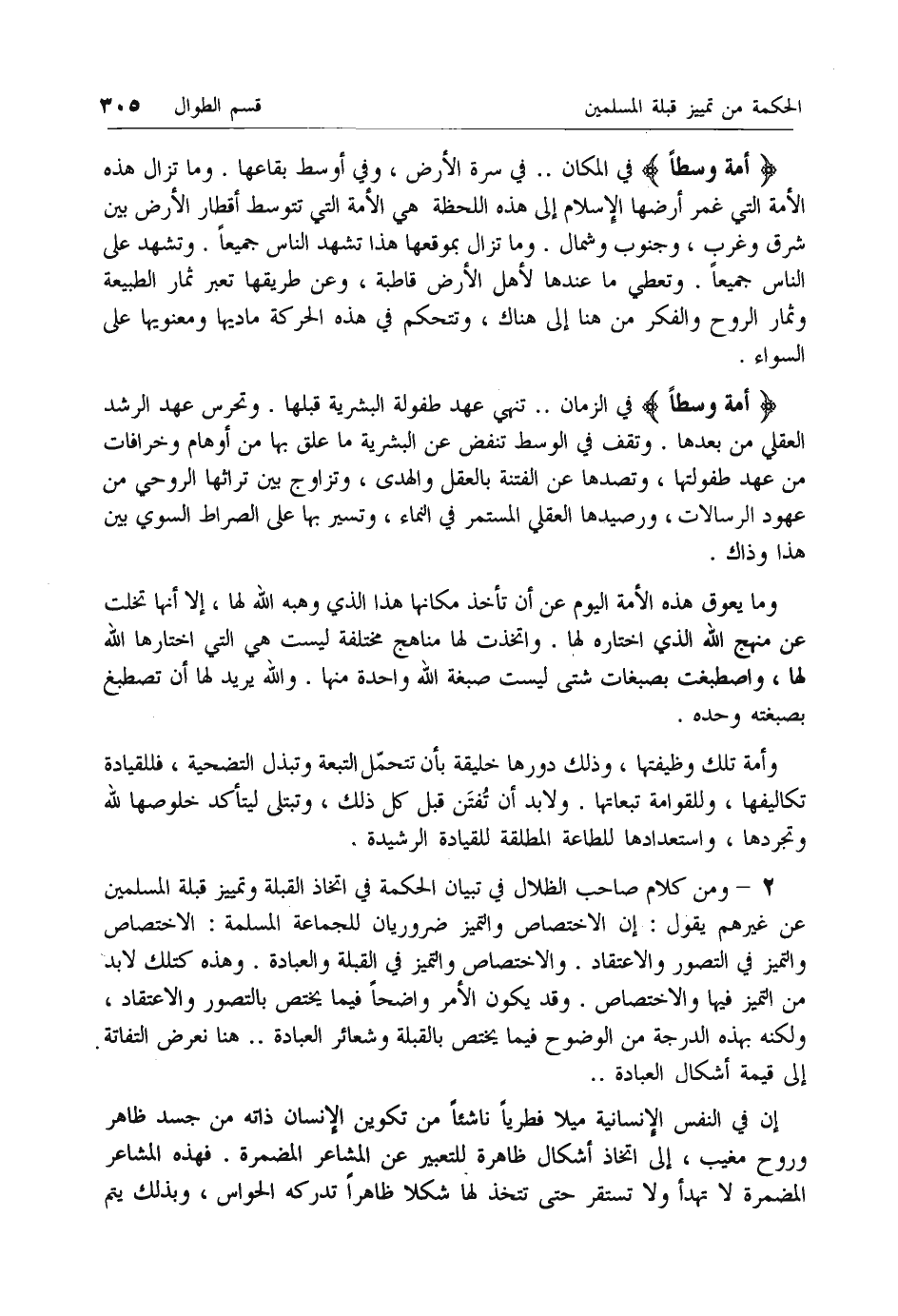 2 - ومن كلام صاحب الظلال في تبيان الحكمة في اتخاذ القبلة وتمييز قبلة المسلمين عن غيرهم يقول: إن الاختصاص والتميز ضروريان للجماعة المسلمة: الاختصاص
