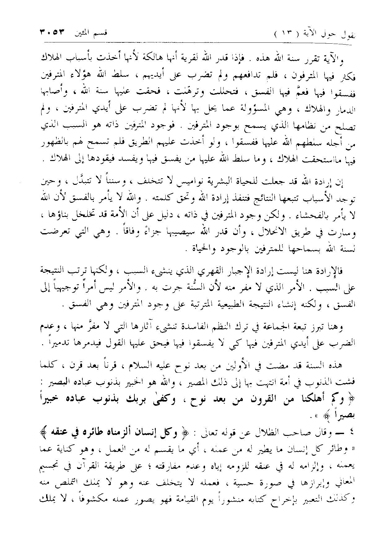 والآية تقرر سنة الله هذه. فإذا قدر الله لقرية أنها هالكة لأنها أخذت بأسباب الهلاك فكثر فيها المترفون، فلم تدافعهم ولم تضرب على أيديهم، سلط الله هؤلاء المترفين ففسقوا فيها فعمّ فيها الفسق، فتحللت وترهّلت، فحقت عليها سنة الله، وأصابها الدمار والهلاك، وهي المسئولة عما يحل بها لأنها لم تضرب على أيدي المترفين، ولم تصلح من نظامها الذي يسمح بوجود المترفين. فوجود المترفين ذاته هو السبب الذي من أجله سلطهم الله عليها ففسقوا، ولو أخذت عليهم الطريق فلم تسمح لهم بالظهور فيها ما استحقت الهلاك، وما سلط الله عليها من يفسق فيها ويفسد فيقودها إلى الهلاك.