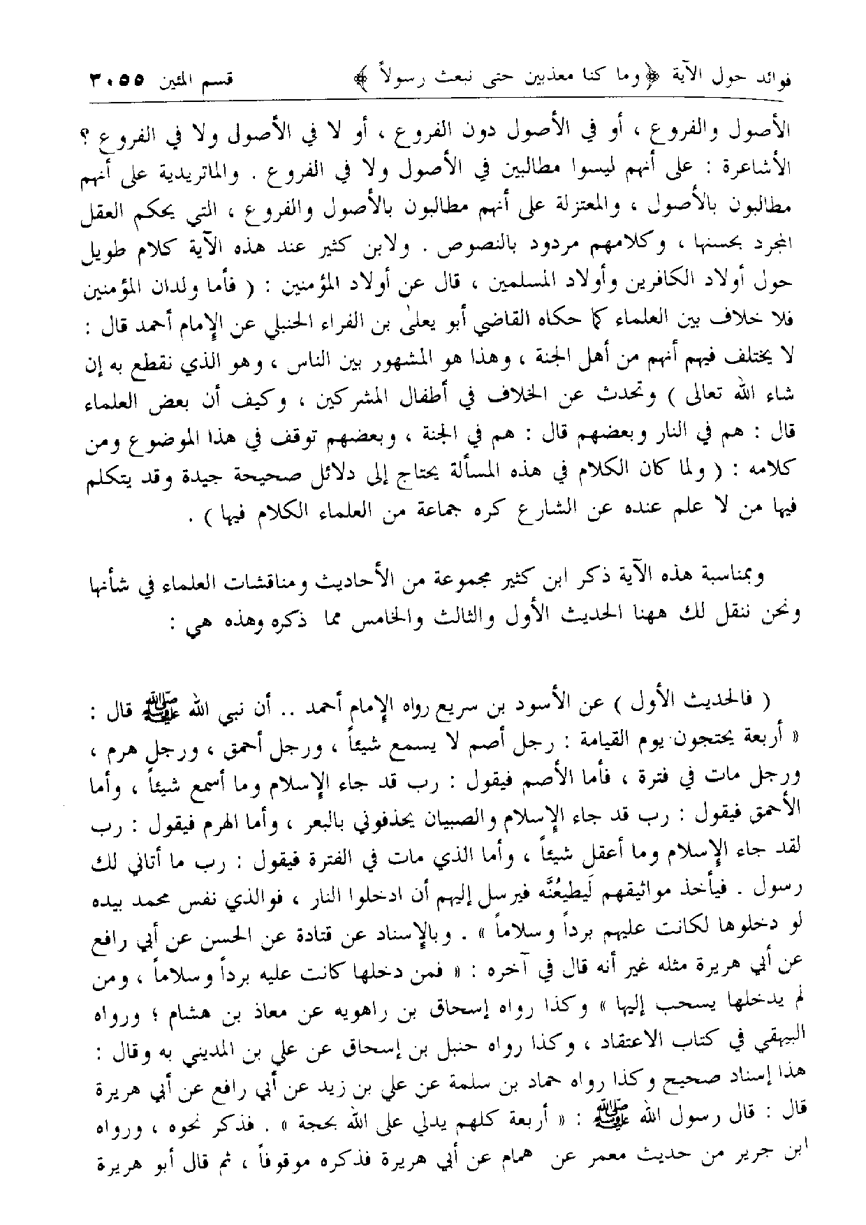 الأحمق فيقول: رب قد جاء الإسلام والصبيان يحذفوني بالبعر، وأما الهرم فيقول: رب لقد جاء الإسلام وما أعقل شيئا، وأما الذي مات في الفترة فيقول: رب ما أتاني لك رسول. فيأخذ مواثيقهم ليطيعنّه فيرسل إليهم أن ادخلوا النار، فو الذي نفس محمد بيده لو دخلوها لكانت عليهم بردا وسلاما». وبالإسناد عن قتادة عن الحسن عن أبي رافع عن أبي هريرة مثله غير أنه قال في آخره: «فمن دخلها كانت عليه بردا وسلاما، ومن لم يدخلها يسحب إليها» وكذا رواه إسحاق بن راهويه عن معاذ بن هشام؛ ورواه البيهقي في كتاب الاعتقاد، وكذا رواه حنبل بن إسحاق عن علي بن المديني به وقال: