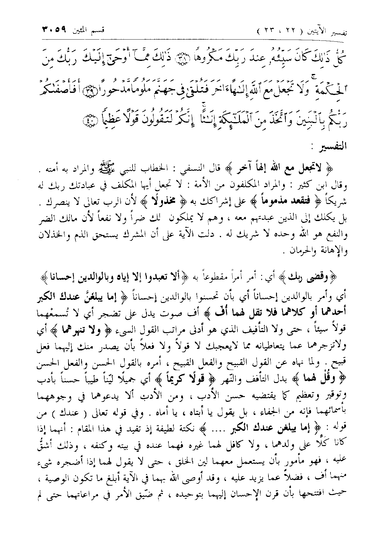 وَقَضى رَبُّكَ أي: أمر أمرا مقطوعا به أَلَّا تَعْبُدُوا إِلَّا إِيَّاهُ وَبِالْوالِدَيْنِ إِحْساناً أي وأمر بالوالدين إحسانا أي بأن تحسنوا بالوالدين إحسانا إِمَّا يَبْلُغَنَّ عِنْدَكَ الْكِبَرَ أَحَدُهُما أَوْ كِلاهُما فَلا تَقُلْ لَهُما أُفٍّ أف صوت يدل على تضجر أي لا تسمعهما قولا سيئا، حتى ولا التأفيف الذي هو أدنى مراتب القول السيئ وَلا تَنْهَرْهُما أي ولا تزجرهما عما يتعاطيانه مما لا يعجبك لا قولا ولا فعلا بأن يصدر منك إليهما فعل قبيح. ولما نهاه عن القول القبيح والفعل القبيح، أمره بالقول الحسن والفعل الحسن وَقُلْ لَهُما بدل التأفف والنّهر قَوْلًا كَرِيماً أي جميلا ليّنا طيبا حسنا بأدب وتوقير وتعظيم كما يقتضيه حسن الأدب، ومن الأدب ألا يدعوهما في وجوههما بأسمائهما فإنه من الجفاء، بل يقول يا أبتاه، يا أماه. وفي قوله تعالى (عندك) من قوله: إِمَّا يَبْلُغَنَّ عِنْدَكَ الْكِبَرَ .... نكتة لطيفة إذ تفيد في هذا المقام: أنهما إذا كانا كلّا على ولدهما، ولا كافل لهما غيره فهما عنده في بيته وكنفه، وذلك أشقّ عليه، فهو مأمور بأن يستعمل معهما لين الخلق، حتى لا يقول لهما إذا أضجره شئ منهما أف، فضلا عما يزيد عليه، وقد أوصى الله بهما في الآية أبلغ ما تكون الوصية، حيث افتتحها بأن قرن الإحسان إليهما بتوحيده، ثم ضيّق الأمر في مراعاتهما حتى لم