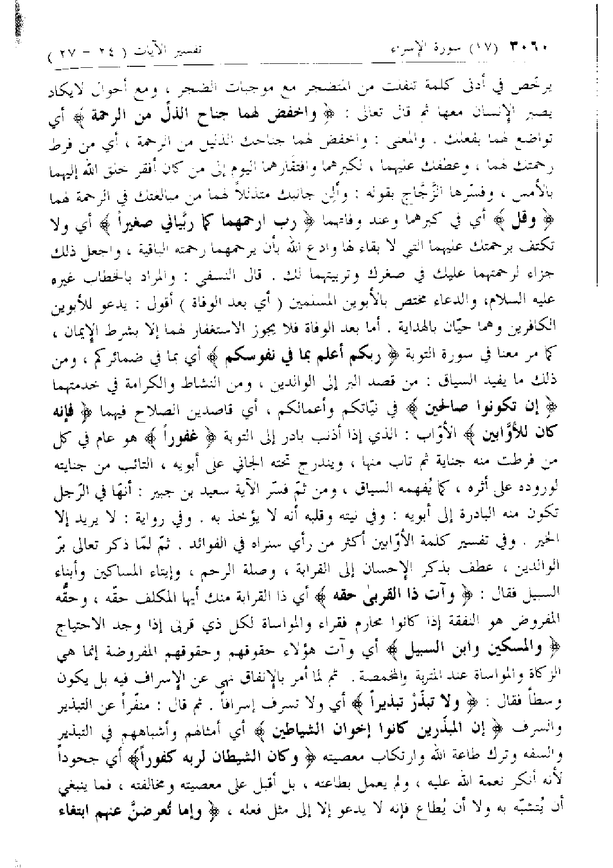 ثمّ لمّا ذكر تعالى برّ الوالدين، عطف بذكر الإحسان إلى القرابة، وصلة الرحم، وإيتاء المساكين وأبناء السبيل فقال: وَآتِ ذَا الْقُرْبى حَقَّهُ أي ذا القرابة منك أيها المكلف حقّه، وحقّه المفروض هو النفقة إذا كانوا محارم فقراء والمواساة لكل ذي قربى إذا وجد الاحتياج وَالْمِسْكِينَ وَابْنَ السَّبِيلِ أي وآت هؤلاء حقوقهم وحقوقهم المفروضة إنما هي الزكاة والمواساة عند المتربة والمخمصة. ثم لما أمر بالإنفاق نهى عن الإسراف فيه بل يكون وسطا فقال: وَلا تُبَذِّرْ تَبْذِيراً أي ولا تسرف إسرافا.