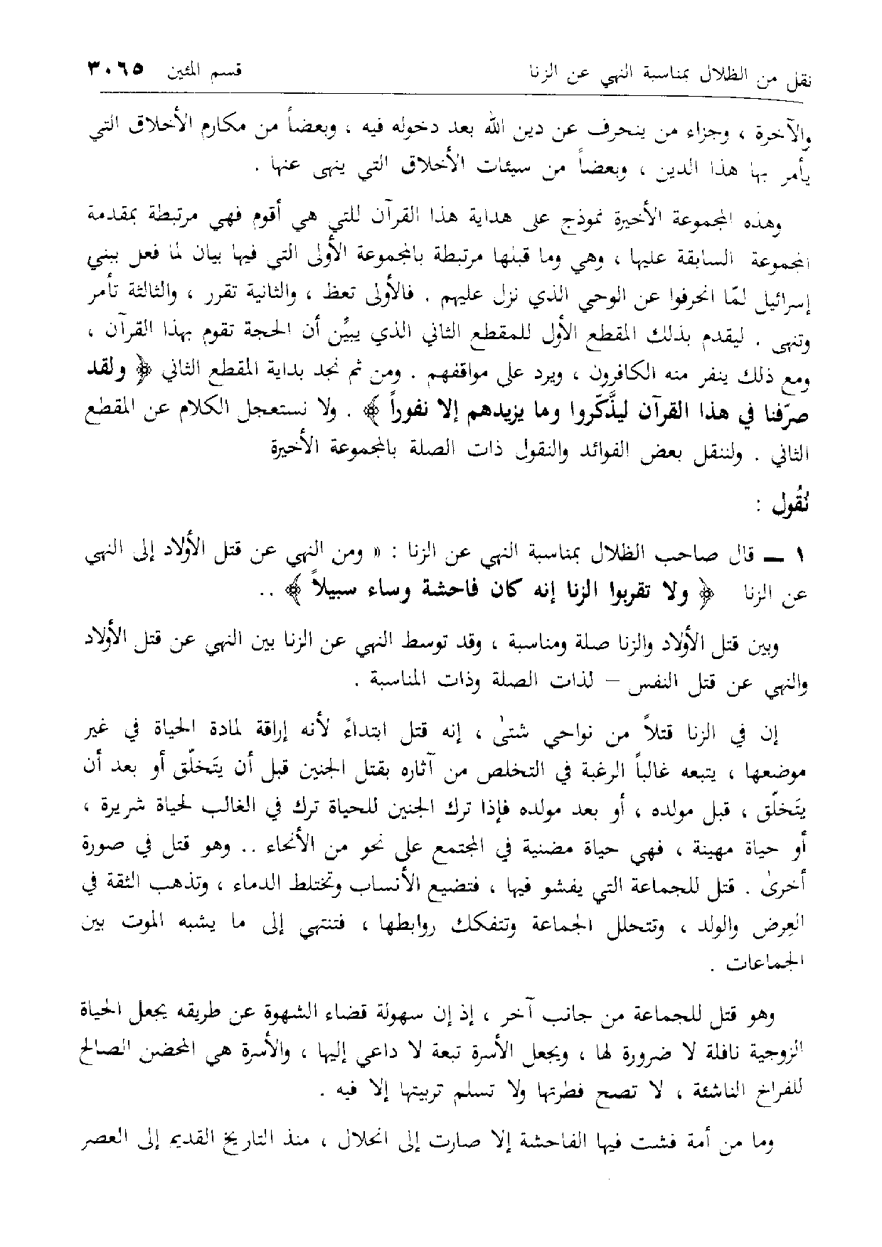 قال صاحب الظلال بمناسبة النهي عن الزنا: «ومن النهي عن قتل الأولاد إلى النهي عن الزنا وَلا تَقْرَبُوا الزِّنى إِنَّهُ كانَ فاحِشَةً وَساءَ سَبِيلًا ..