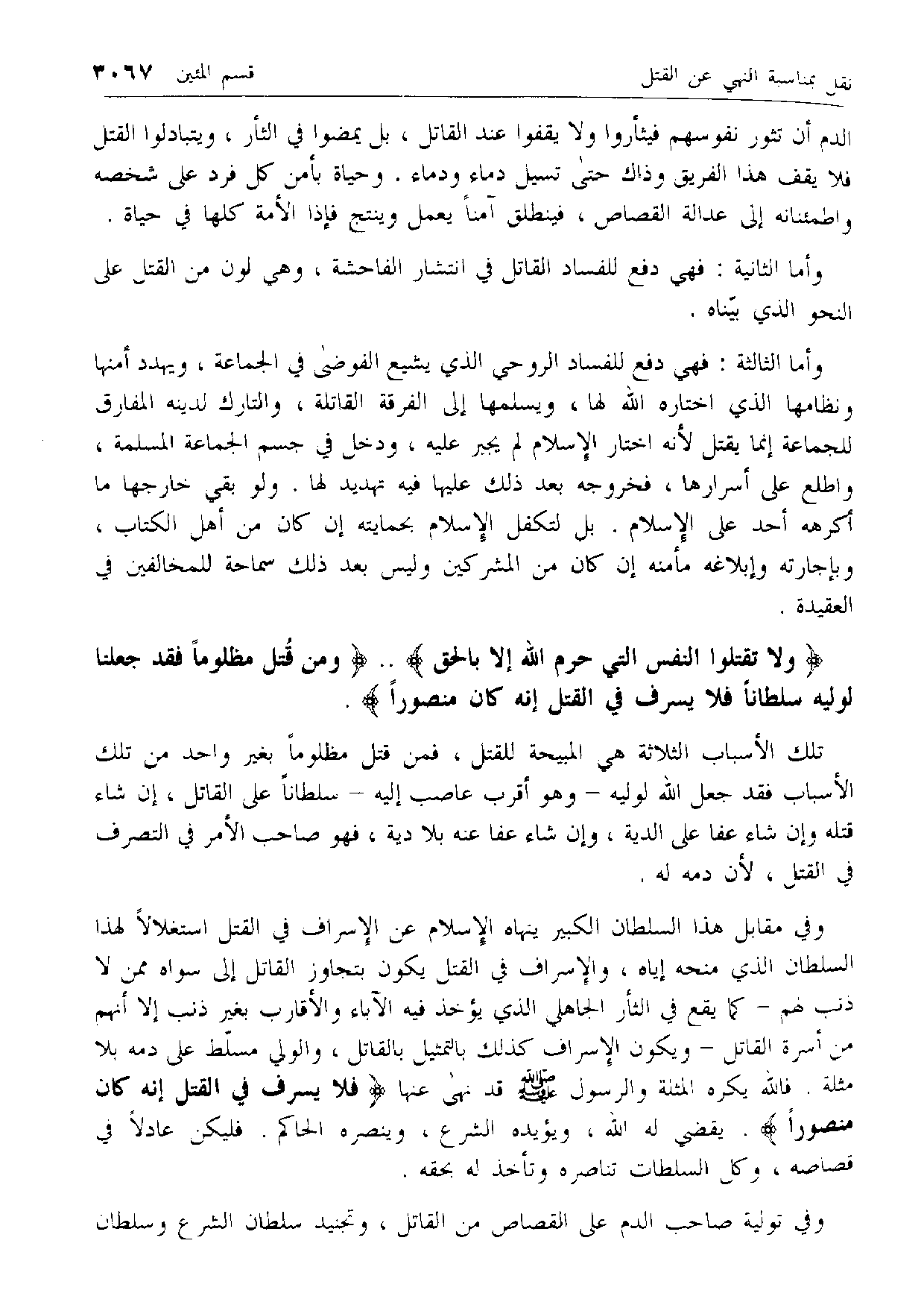 وَلا تَقْتُلُوا النَّفْسَ الَّتِي حَرَّمَ اللَّهُ إِلَّا بِالْحَقِّ .. وَمَنْ قُتِلَ مَظْلُوماً فَقَدْ جَعَلْنا لِوَلِيِّهِ سُلْطاناً فَلا يُسْرِفْ فِي الْقَتْلِ إِنَّهُ كانَ مَنْصُوراً.