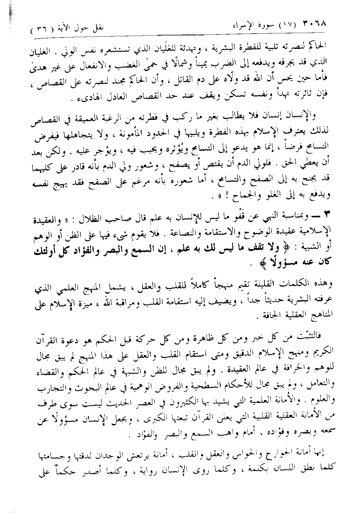 وبمناسبة النهي عن قفو ما ليس للإنسان به علم قال صاحب الظلال: «والعقيدة الإسلامية عقيدة الوضوح والاستقامة والنصاعة. فلا يقوم شئ فيها على الظن أو الوهم أو الشبهة: وَلا تَقْفُ ما لَيْسَ لَكَ بِهِ عِلْمٌ، إِنَّ السَّمْعَ وَالْبَصَرَ وَالْفُؤادَ كُلُّ أُولئِكَ كانَ عَنْهُ مَسْؤُلًا.