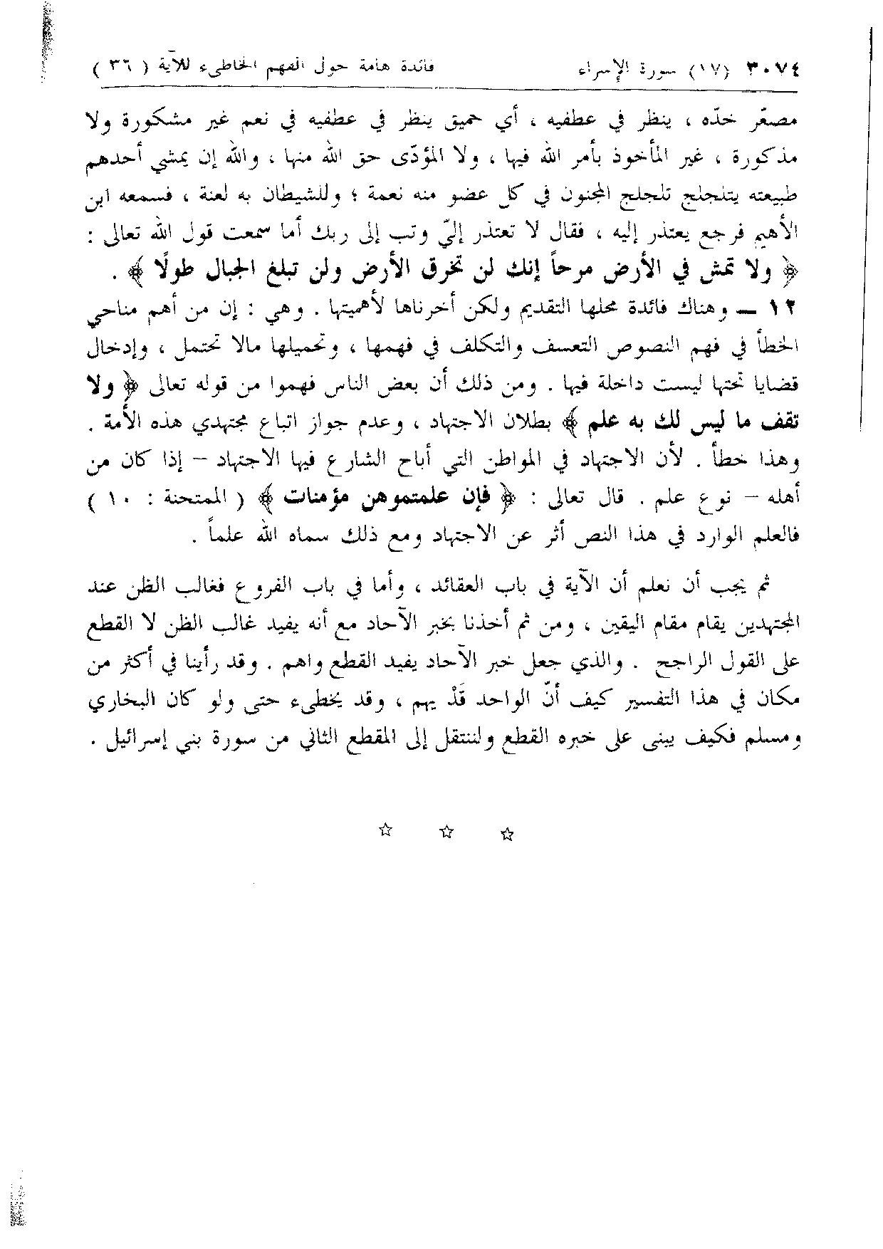 وهناك فائدة محلها التقديم ولكن أخرناها لأهميتها. وهي: إن من أهم مناحي الخطأ في فهم النصوص التعسف والتكلف في فهمها، وتحميلها ما لا تحتمل، وإدخال قضايا تحتها ليست داخلة فيها. ومن ذلك أن بعض الناس فهموا من قوله تعالى وَلا تَقْفُ ما لَيْسَ لَكَ بِهِ عِلْمٌ بطلان الاجتهاد، وعدم جواز اتباع مجتهدي هذه الأمة.