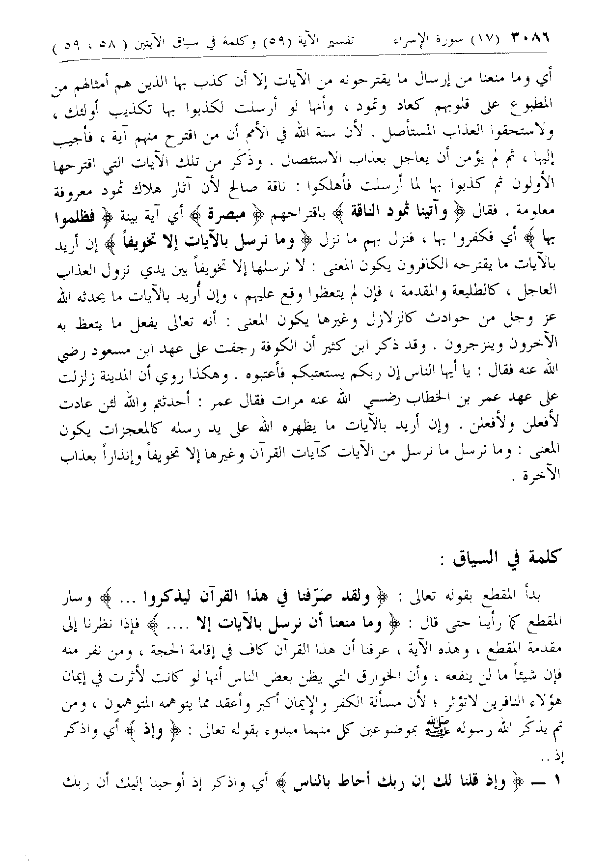 بدأ المقطع بقوله تعالى: وَلَقَدْ صَرَّفْنا فِي هذَا الْقُرْآنِ لِيَذَّكَّرُوا ... وسار المقطع كما رأينا حتى قال: وَما مَنَعَنا أَنْ نُرْسِلَ بِالْآياتِ إِلَّا .... فإذا نظرنا إلى مقدمة المقطع، وهذه الآية، عرفنا أن هذا القرآن كاف في إقامة الحجة، ومن نفر منه فإن شيئا ما لن ينفعه، وأن الخوارق التي يظن بعض الناس أنها لو كانت لأثرت في إيمان هؤلاء النافرين لا تؤثر؛ لأن مسألة الكفر والإيمان أكبر وأعقد مما يتوهمه المتوهمون، ومن ثم يذكّر الله رسوله صلّى الله عليه وسلّم بموضوعين كل منهما مبدوء بقوله تعالى: وَإِذْ أي واذكر إذ ..