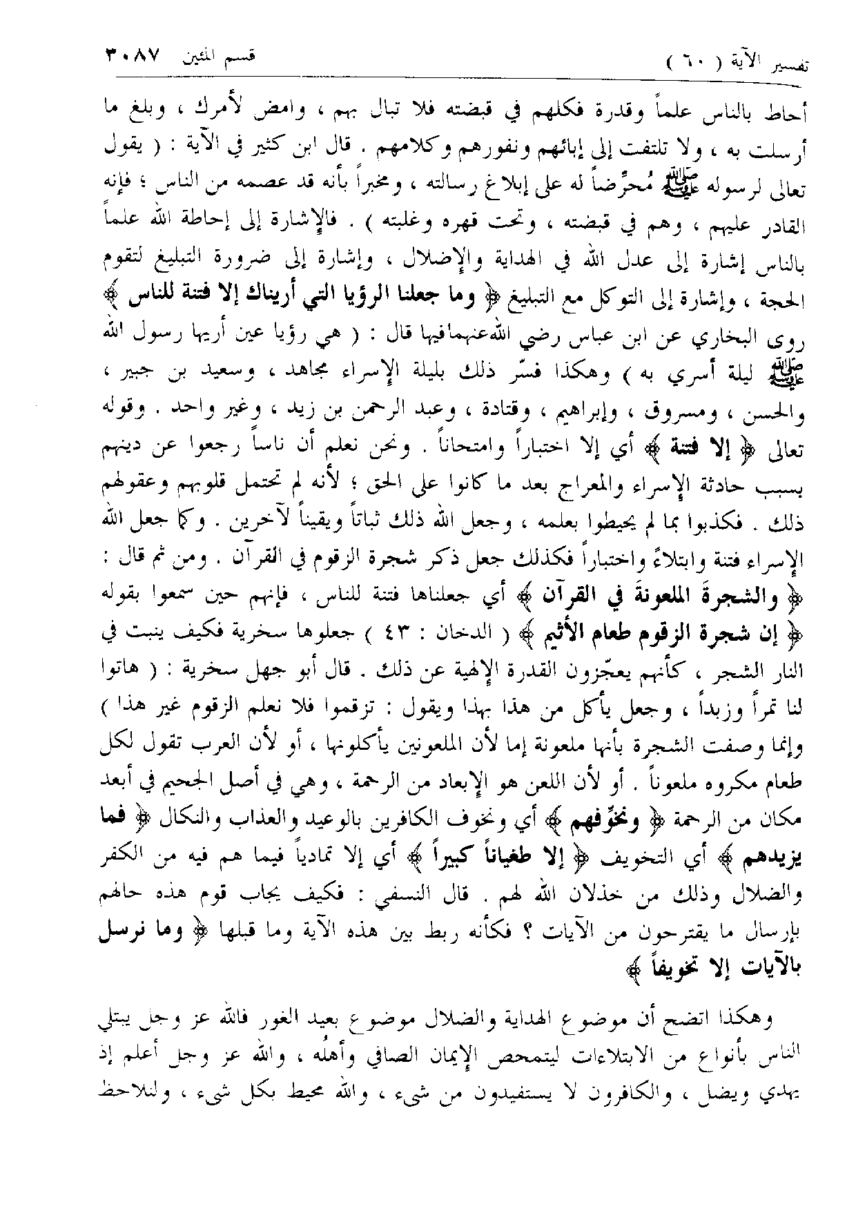 أحاط بالناس علما وقدرة فكلهم في قبضته فلا تبال بهم، وامض لأمرك، وبلغ ما أرسلت به، ولا تلتفت إلى إبائهم ونفورهم وكلامهم. قال ابن كثير في الآية: (يقول تعالى لرسوله صلّى الله عليه وسلّم محرّضا له على إبلاغ رسالته، ومخبرا بأنه قد عصمه من الناس؛ فإنه القادر عليهم، وهم في قبضته، وتحت قهره وغلبته). فالإشارة إلى إحاطة الله علما بالناس إشارة إلى عدل الله في الهداية والإضلال، وإشارة إلى ضرورة التبليغ لتقوم الحجة، وإشارة إلى التوكل مع التبليغ وَما جَعَلْنَا الرُّؤْيَا الَّتِي أَرَيْناكَ إِلَّا فِتْنَةً لِلنَّاسِ روى البخاري عن ابن عباس رضي الله عنهما فيها قال: (هي رؤيا عين أريها رسول الله صلّى الله عليه وسلّم ليلة أسري به) وهكذا فسّر ذلك بليلة الإسراء مجاهد، وسعيد بن جبير، والحسن، ومسروق، وإبراهيم، وقتادة، وعبد الرحمن بن زيد، وغير واحد. وقوله تعالى إِلَّا فِتْنَةً أي إلا اختبارا وامتحانا. ونحن نعلم أن ناسا رجعوا عن دينهم بسبب حادثة الإسراء والمعراج بعد ما كانوا على الحق؛ لأنه لم تحتمل قلوبهم وعقولهم ذلك. فكذبوا بما لم يحيطوا بعلمه، وجعل الله ذلك ثباتا ويقينا لآخرين. وكما جعل الله الإسراء فتنة وابتلاء واختبارا فكذلك جعل ذكر شجرة الزقوم في القرآن. ومن ثم قال: