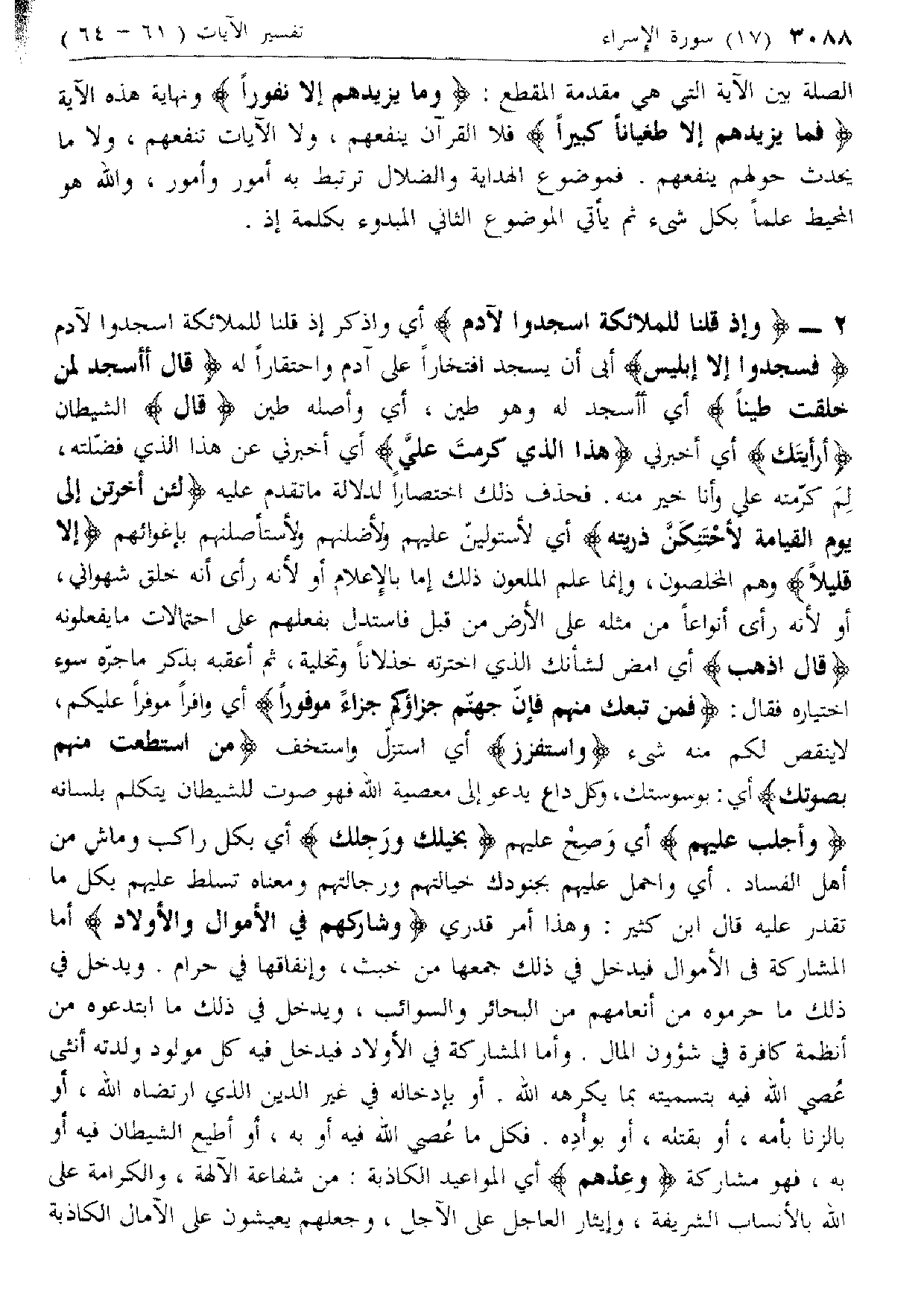 وَاسْتَفْزِزْ أي استزلّ واستخف مَنِ اسْتَطَعْتَ مِنْهُمْ بِصَوْتِكَ أي: بوسوستك، وكل داع يدعو إلى معصية الله فهو صوت للشيطان يتكلم بلسانه وَأَجْلِبْ عَلَيْهِمْ أي وصح عليهم بِخَيْلِكَ وَرَجِلِكَ أي بكل راكب وماش من أهل الفساد. أي واحمل عليهم بجنودك خيالتهم ورجالتهم ومعناه تسلط عليهم بكل ما تقدر عليه قال ابن كثير: وهذا أمر قدري وَشارِكْهُمْ فِي الْأَمْوالِ وَالْأَوْلادِ أما المشاركة فى الأموال فيدخل في ذلك جمعها من خبث، وإنفاقها في حرام. ويدخل في ذلك ما حرموه من أنعامهم من البحائر والسوائب، ويدخل في ذلك ما ابتدعوه من أنظمة كافرة في شئون المال. وأما المشاركة في الأولاد فيدخل فيه كل مولود ولدته أنثى عصي الله فيه بتسميته بما يكرهه الله. أو بإدخاله في غير الدين الذي ارتضاه الله، أو بالزنا بأمه، أو بقتله، أو بوأده. فكل ما عصي الله فيه أو به، أو أطيع الشيطان فيه أو به، فهو مشاركة وَعِدْهُمْ أي المواعيد الكاذبة: من شفاعة الآلهة، والكرامة على الله بالأنساب الشريفة، وإيثار العاجل على الآجل، وجعلهم يعيشون على الآمال الكاذبة