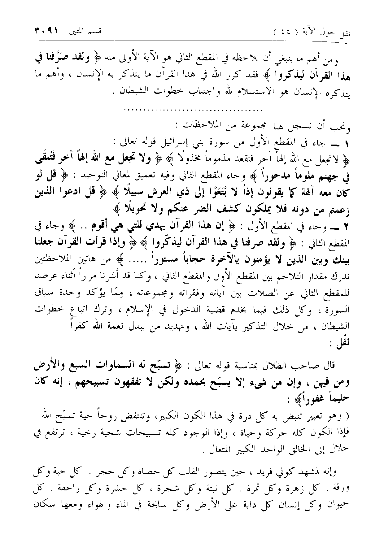 (وهو تعبير تنبض به كل ذرة في هذا الكون الكبير، وتنتفض روحا حية تسبّح الله، فإذا الكون كله حركة وحياة، وإذا الوجود كله تسبيحات شجية رخية، ترتفع في جلال إلى الخالق الواحد الكبير المتعال.