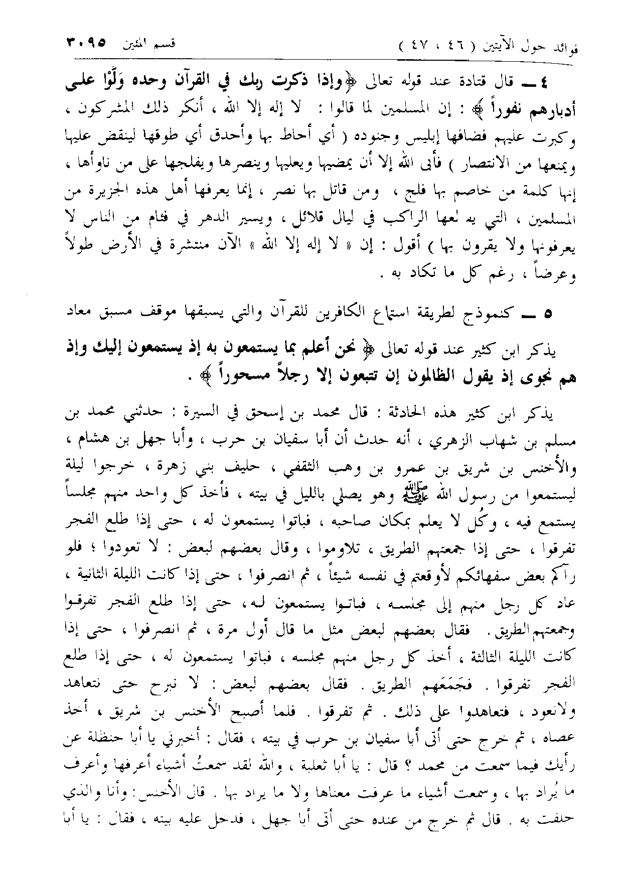 كنموذج لطريقة استماع الكافرين للقرآن والتي يسبقها موقف مسبق معاد يذكر ابن كثير عند قوله تعالى نَحْنُ أَعْلَمُ بِما يَسْتَمِعُونَ بِهِ إِذْ يَسْتَمِعُونَ إِلَيْكَ وَإِذْ هُمْ نَجْوى إِذْ يَقُولُ الظَّالِمُونَ إِنْ تَتَّبِعُونَ إِلَّا رَجُلًا مَسْحُوراً.