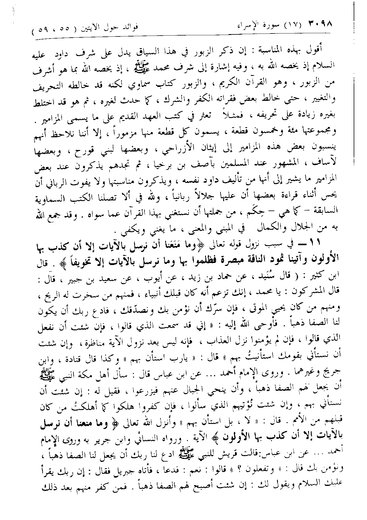 في سبب نزول قوله تعالى وَما مَنَعَنا أَنْ نُرْسِلَ بِالْآياتِ إِلَّا أَنْ كَذَّبَ بِهَا الْأَوَّلُونَ وَآتَيْنا ثَمُودَ النَّاقَةَ مُبْصِرَةً فَظَلَمُوا بِها وَما نُرْسِلُ بِالْآياتِ إِلَّا تَخْوِيفاً. قال ابن كثير: (قال سنيد، عن حماد بن زيد، عن أيوب، عن سعيد بن جبير، قال: