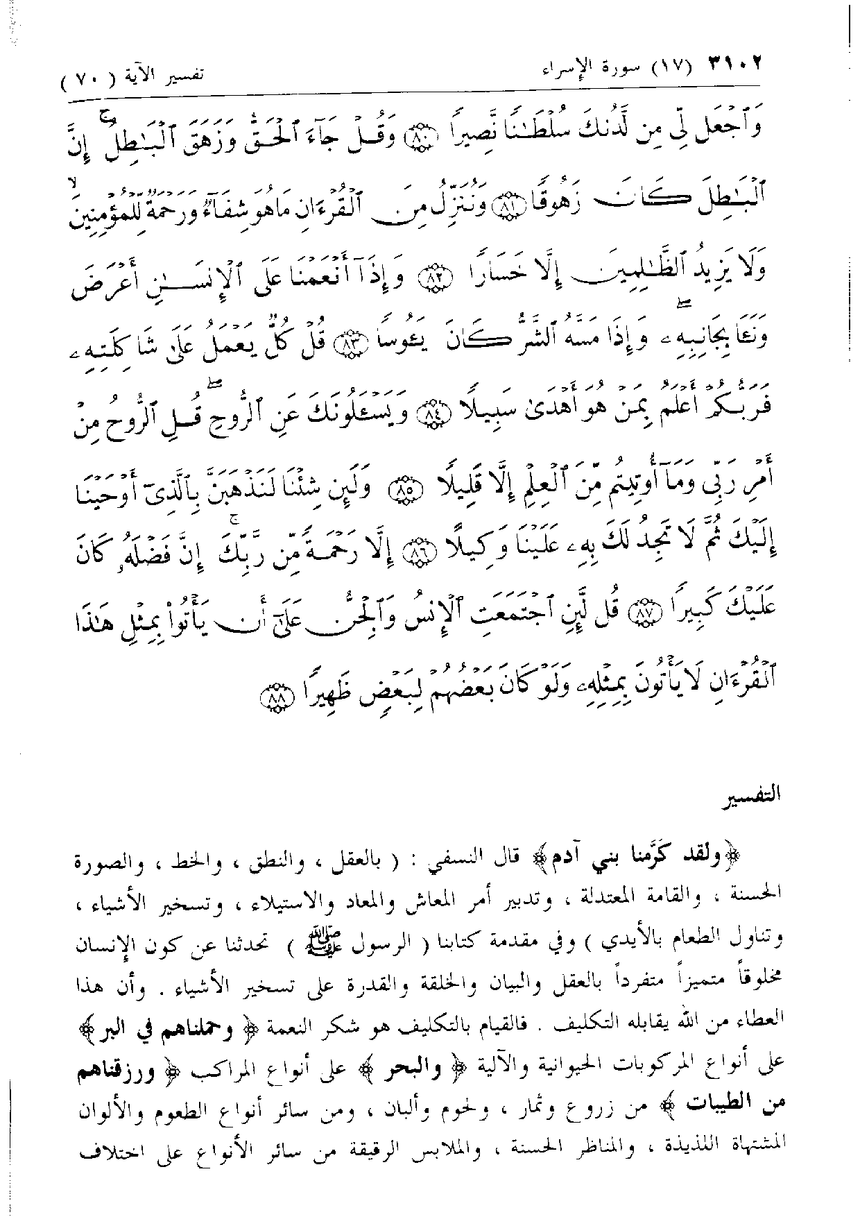 وَلَقَدْ كَرَّمْنا بَنِي آدَمَ قال النسفي: (بالعقل، والنطق، والخط، والصورة الحسنة، والقامة المعتدلة، وتدبير أمر المعاش والمعاد والاستيلاء، وتسخير الأشياء، وتناول الطعام بالأيدي) وفي مقدمة كتابنا (الرسول صلّى الله عليه وسلّم) تحدثنا عن كون الإنسان مخلوقا متميزا متفردا بالعقل والبيان والخلقة والقدرة على تسخير الأشياء. وأن هذا العطاء من الله يقابله التكليف. فالقيام بالتكليف هو شكر النعمة وَحَمَلْناهُمْ فِي الْبَرِّ على أنواع المركوبات الحيوانية والآلية وَالْبَحْرِ على أنواع المراكب وَرَزَقْناهُمْ مِنَ الطَّيِّباتِ من زروع وثمار، ولحوم وألبان، ومن سائر أنواع الطعوم والألوان المشتهاة اللذيذة، والمناظر الحسنة، والملابس الرقيقة من سائر الأنواع على اختلاف