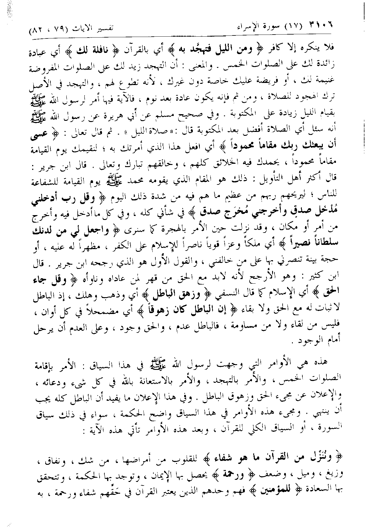 هذه هي الأوامر التي وجهت لرسول الله صلّى الله عليه وسلّم في هذا السياق: الأمر بإقامة الصلوات الخمس، والأمر بالتهجد، والأمر بالاستعانة بالله في كل شئ ودعائه، والإعلان عن مجئ الحق وزهوق الباطل. وفي هذا الإعلان ما يفيد أن الباطل كله يجب أن ينتهي. ومجئ هذه الأوامر في هذا السياق واضح الحكمة، سواء في ذلك سياق السورة، أو السياق الكلي للقرآن، وبعد هذه الأوامر تأتي هذه الآية: