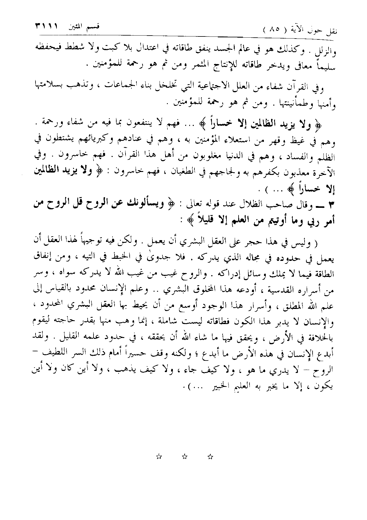 (وليس في هذا حجر على العقل البشري أن يعمل. ولكن فيه توجيها لهذا العقل أن يعمل في حدوده في مجاله الذي يدركه. فلا جدوى في الخبط في التيه، ومن إنفاق الطاقة فيما لا يملك وسائل إدراكه. والروح غيب من غيب الله لا يدركه سواه، وسر من أسراره القدسية، أودعه هذا المخلوق البشري .. وعلم الإنسان محدود بالقياس إلى علم الله المطلق، وأسرار هذا الوجود أوسع من أن يحيط بها العقل البشري المحدود، والإنسان لا يدبر هذا الكون فطاقاته ليست شاملة، إنما وهب منها بقدر حاجته ليقوم بالخلافة في الأرض، ويحقق فيها ما شاء الله أن يحققه، في حدود علمه القليل. ولقد أبدع الإنسان في هذه الأرض ما أبدع؛ ولكنه وقف حسيرا أمام ذلك السر اللطيف- الروح- لا يدري ما هو، ولا كيف جاء، ولا كيف يذهب، ولا أين كان ولا أين يكون، إلا ما يخبر به العليم الخبير ... ).