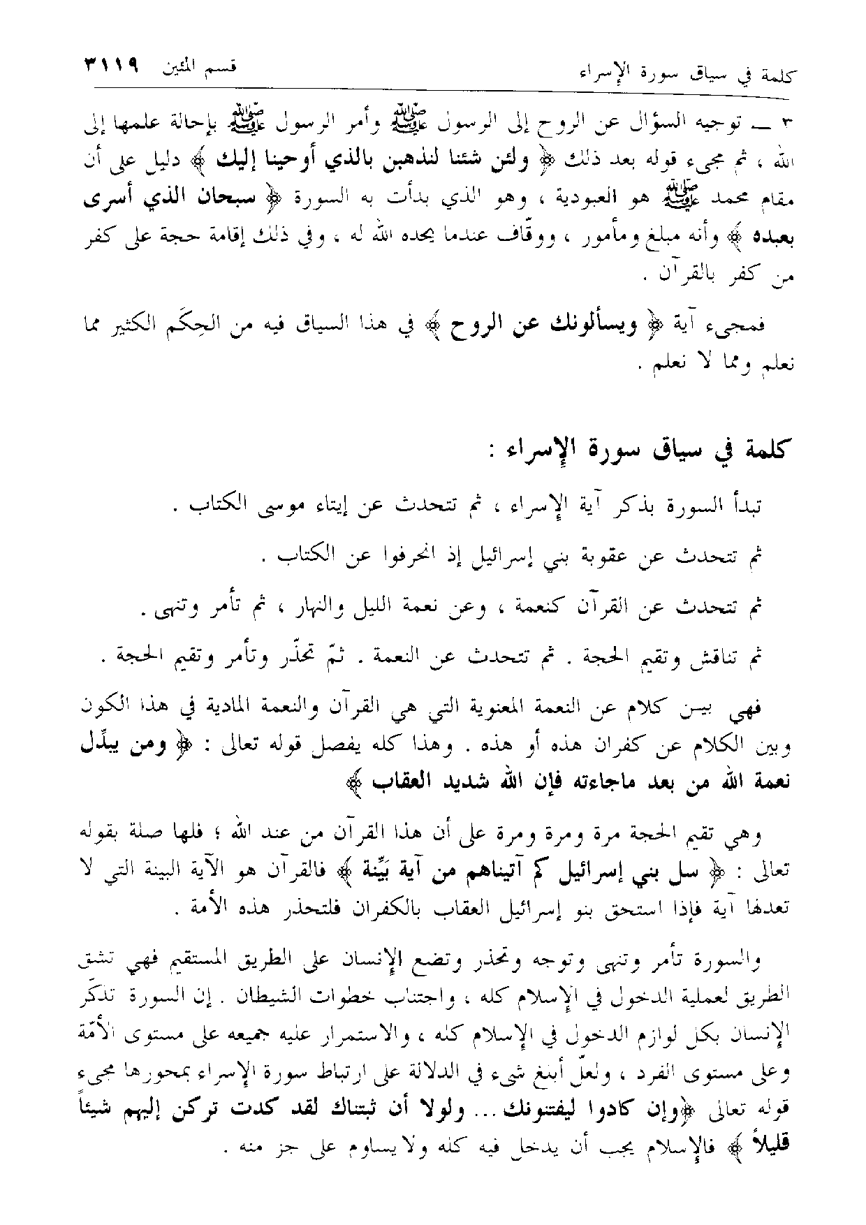 3 - توجيه السؤال عن الروح إلى الرسول صلّى الله عليه وسلّم وأمر الرسول صلّى الله عليه وسلّم بإحالة علمها إلى الله، ثم مجئ قوله بعد ذلك وَلَئِنْ شِئْنا لَنَذْهَبَنَّ بِالَّذِي أَوْحَيْنا إِلَيْكَ دليل على أن مقام محمد صلّى الله عليه وسلّم هو العبودية، وهو الذي بدأت به السورة سُبْحانَ الَّذِي أَسْرى بِعَبْدِهِ وأنه مبلغ ومأمور، ووقّاف عند ما يحده الله له، وفي ذلك إقامة حجة على كفر من كفر بالقرآن.