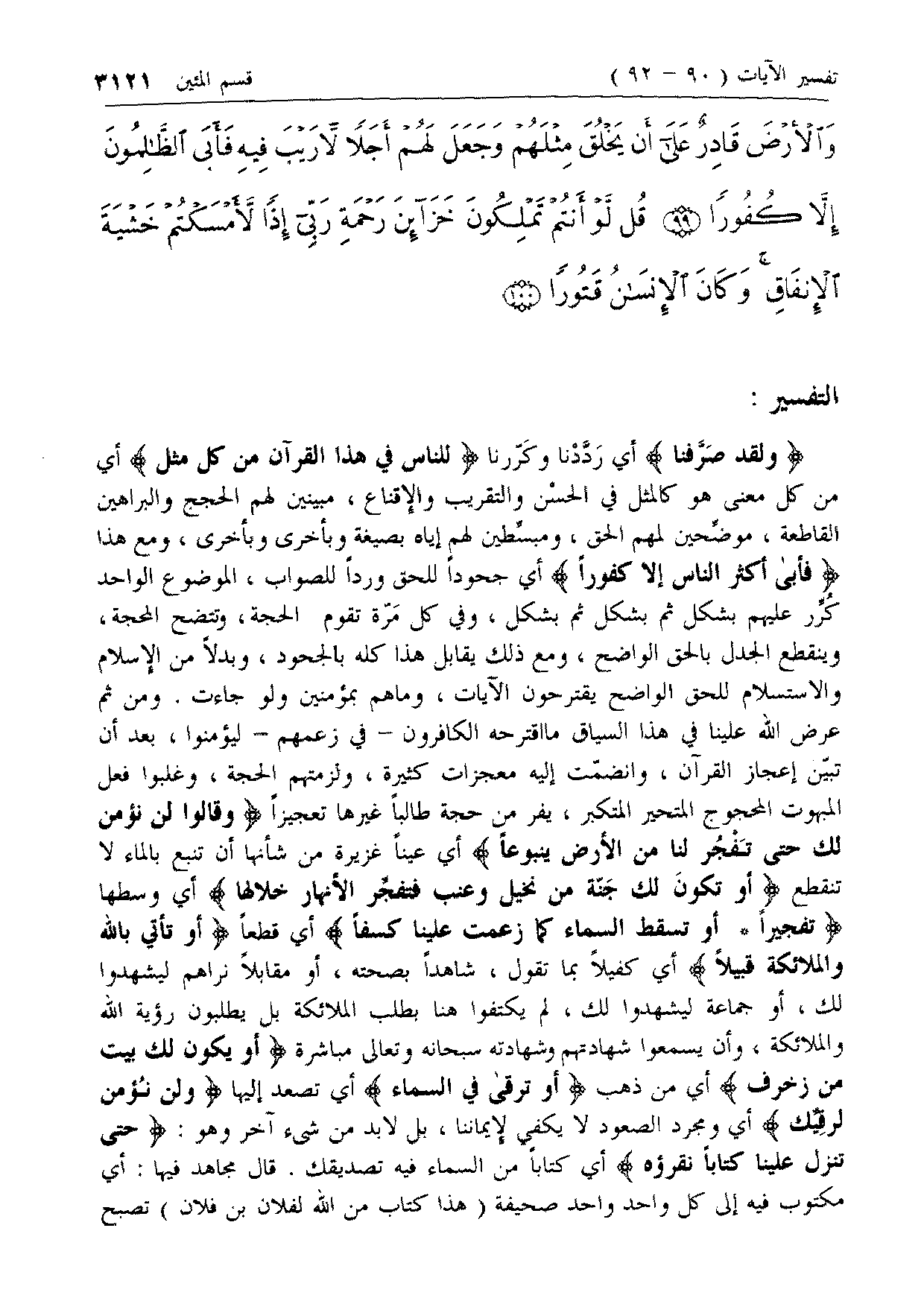 وَلَقَدْ صَرَّفْنا أي ردّدنا وكرّرنا لِلنَّاسِ فِي هذَا الْقُرْآنِ مِنْ كُلِّ مَثَلٍ أي من كل معنى هو كالمثل في الحسن والتقريب والإقناع، مبينين لهم الحجج والبراهين القاطعة، موضّحين لمهم الحق، ومبسّطين لهم إياه بصيغة وبأخرى وبأخرى، ومع هذا فَأَبى أَكْثَرُ النَّاسِ إِلَّا كُفُوراً أي جحودا للحق وردا للصواب، الموضوع الواحد كرّر عليهم بشكل ثم بشكل ثم بشكل، وفي كل مرّة تقوم الحجة، وتتضح المحجة، وينقطع الجدل بالحق الواضح، ومع ذلك يقابل هذا كله بالجحود، وبدلا من الإسلام والاستسلام للحق الواضح يقترحون الآيات، وما هم بمؤمنين ولو جاءت. ومن ثم عرض الله علينا في هذا السياق ما اقترحه الكافرون- في زعمهم- ليؤمنوا، بعد أن تبيّن إعجاز القرآن، وانضمّت إليه معجزات كثيرة، ولزمتهم الحجة، وغلبوا فعل المبهوت المحجوج المتحير المتكبر، يفر من حجة طالبا غيرها تعجيزا