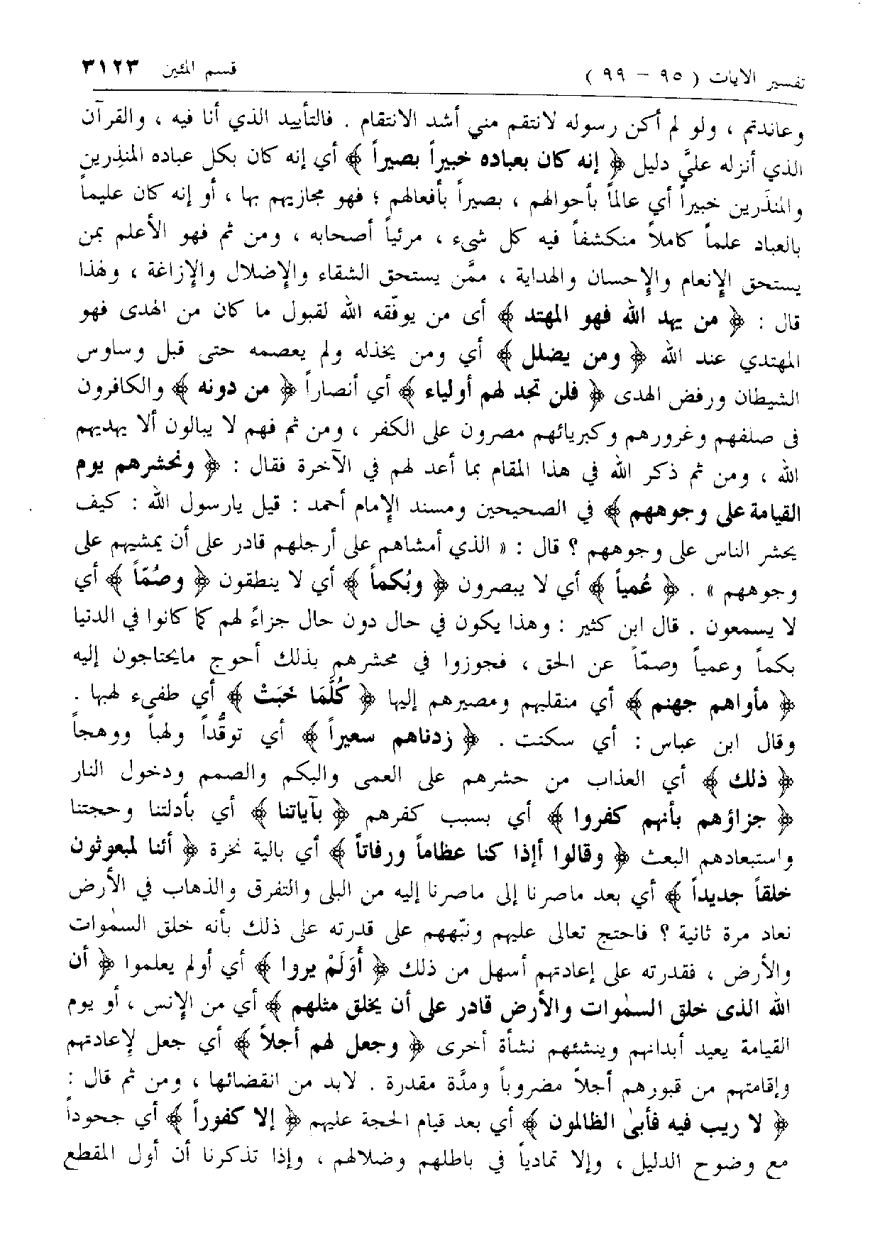 مَنْ يَهْدِ اللَّهُ فَهُوَ الْمُهْتَدِ أى من يوفّقه الله لقبول ما كان من الهدى فهو المهتدي عند الله وَمَنْ يُضْلِلْ أي ومن يخذله ولم يعصمه حتى قبل وساوس الشيطان ورفض الهدى فَلَنْ تَجِدَ لَهُمْ أَوْلِياءَ أي أنصارا مِنْ دُونِهِ والكافرون فى صلفهم وغرورهم وكبريائهم مصرون على الكفر، ومن ثم فهم لا يبالون ألا يهديهم الله، ومن ثم ذكر الله في هذا المقام بما أعد لهم في الآخرة فقال: وَنَحْشُرُهُمْ يَوْمَ الْقِيامَةِ عَلى وُجُوهِهِمْ في الصحيحين ومسند الإمام أحمد: قيل يا رسول الله: كيف يحشر الناس على وجوههم؟ قال: «الذي أمشاهم على أرجلهم قادر على أن يمشيهم على وجوههم». عُمْياً أي لا يبصرون وَبُكْماً أي لا ينطقون وَصُمًّا أي لا يسمعون. قال ابن كثير: وهذا يكون في حال دون حال جزاء لهم كما كانوا في الدنيا بكما وعميا وصمّا عن الحق، فجوزوا في محشرهم بذلك أحوج ما يحتاجون إليه مَأْواهُمْ جَهَنَّمُ أي منقلبهم ومصيرهم إليها كُلَّما خَبَتْ أي طفئ لهبها.