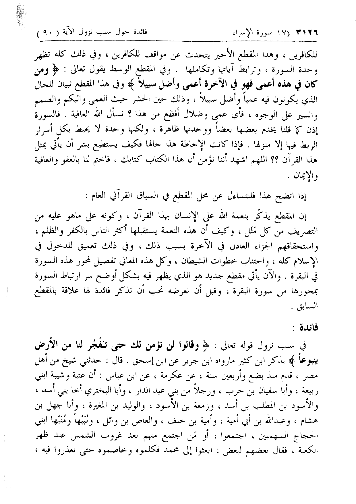 في سبب نزول قوله تعالى: وَقالُوا لَنْ نُؤْمِنَ لَكَ حَتَّى تَفْجُرَ لَنا مِنَ الْأَرْضِ يَنْبُوعاً يذكر ابن كثير ما رواه ابن جرير عن ابن إسحاق. قال: حدثني شيخ من أهل مصر، قدم منذ بضع وأربعين سنة، عن عكرمة، عن ابن عباس: أن عتبة وشيبة ابني ربيعة، وأبا سفيان بن حرب، ورجلا من بني عبد الدار، وأبا البختري أخا بني أسد، والأسود بن المطلب بن أسد، وزمعة بن الأسود، والوليد بن المغيرة، وأبا جهل بن هشام، وعبد الله بن أبي أمية، وأمية بن خلف، والعاص بن وائل، ونبيها ومنبّها ابني الحجاج السهميين، اجتمعوا، أو من اجتمع منهم بعد غروب الشمس عند ظهر الكعبة، فقال بعضهم لبعض: ابعثوا إلى محمد فكلموه وخاصموه حتى تعذروا فيه،