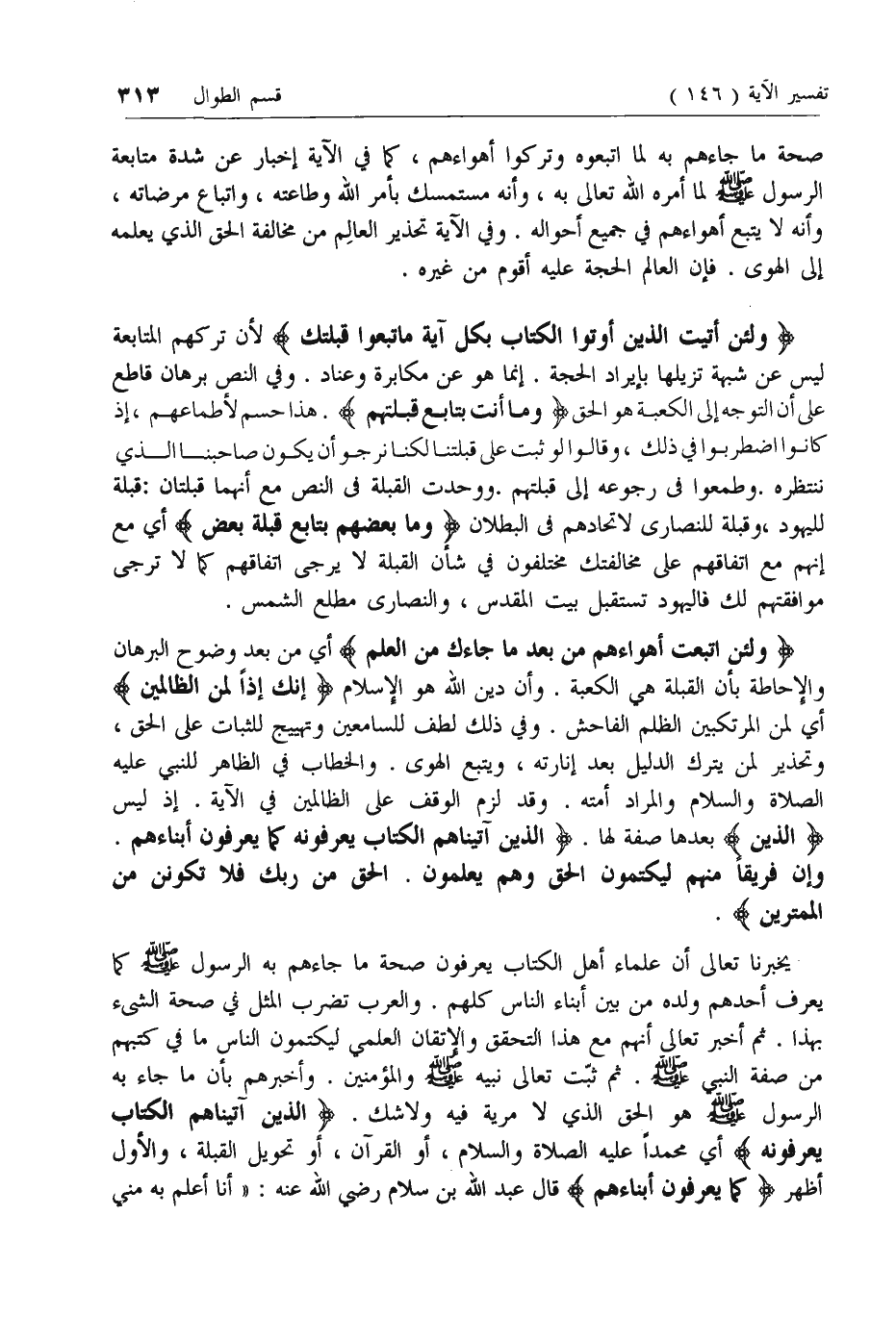 يخبرنا تعالى أن علماء أهل الكتاب يعرفون صحة ما جاءهم به الرسول صلى الله عليه وسلم كما يعرف أحدهم ولده من بين أبناء الناس كلهم. والعرب تضرب المثل في صحة الشئ بهذا. ثم أخبر تعالى أنهم مع هذا التحقق والإتقان العلمي ليكتمون الناس ما في كتبهم من صفة النبي صلى الله عليه وسلم. ثم ثبت تعالى نبيه صلى الله عليه وسلم والمؤمنين. وأخبرهم بأن ما جاء به الرسول صلى الله عليه وسلم هو الحق الذي لا مرية فيه ولا شك. الَّذِينَ آتَيْناهُمُ الْكِتابَ يَعْرِفُونَهُ أي محمدا عليه الصلاة والسلام، أو القرآن، أو تحويل القبلة، والأول أظهر كَما يَعْرِفُونَ أَبْناءَهُمْ قال عبد الله بن سلام رضي الله عنه: «أنا أعلم به مني
