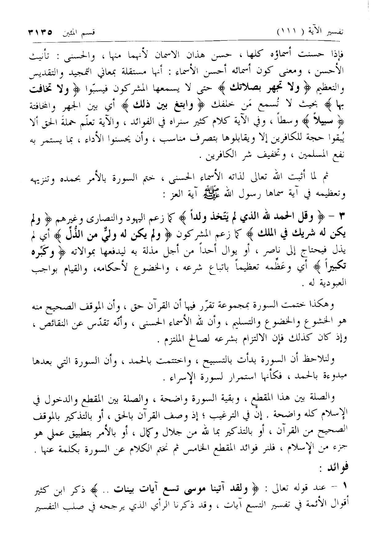 فإذا حسنت أسماؤه كلها، حسن هذان الاسمان لأنهما منها، والحسنى: تأنيث الأحسن، ومعنى كون أسمائه أحسن الأسماء: أنها مستقلة بمعاني التمجيد والتقديس والتعظيم وَلا تَجْهَرْ بِصَلاتِكَ حتى لا يسمعها المشركون فيسبّوا وَلا تُخافِتْ بِها بحيث لا تسمع من خلفك وَابْتَغِ بَيْنَ ذلِكَ أي بين الجهر والمخافتة سَبِيلًا وسطا، وفي الآية كلام كثير سنراه في الفوائد، والآية تعلّم حملة الحق ألا يبقوا حجة للكافرين إلا ويقابلوها بتصرف مناسب، وأن يحسنوا الأداء، بما يستمر به نفع المسلمين، وتخفيف شر الكافرين.