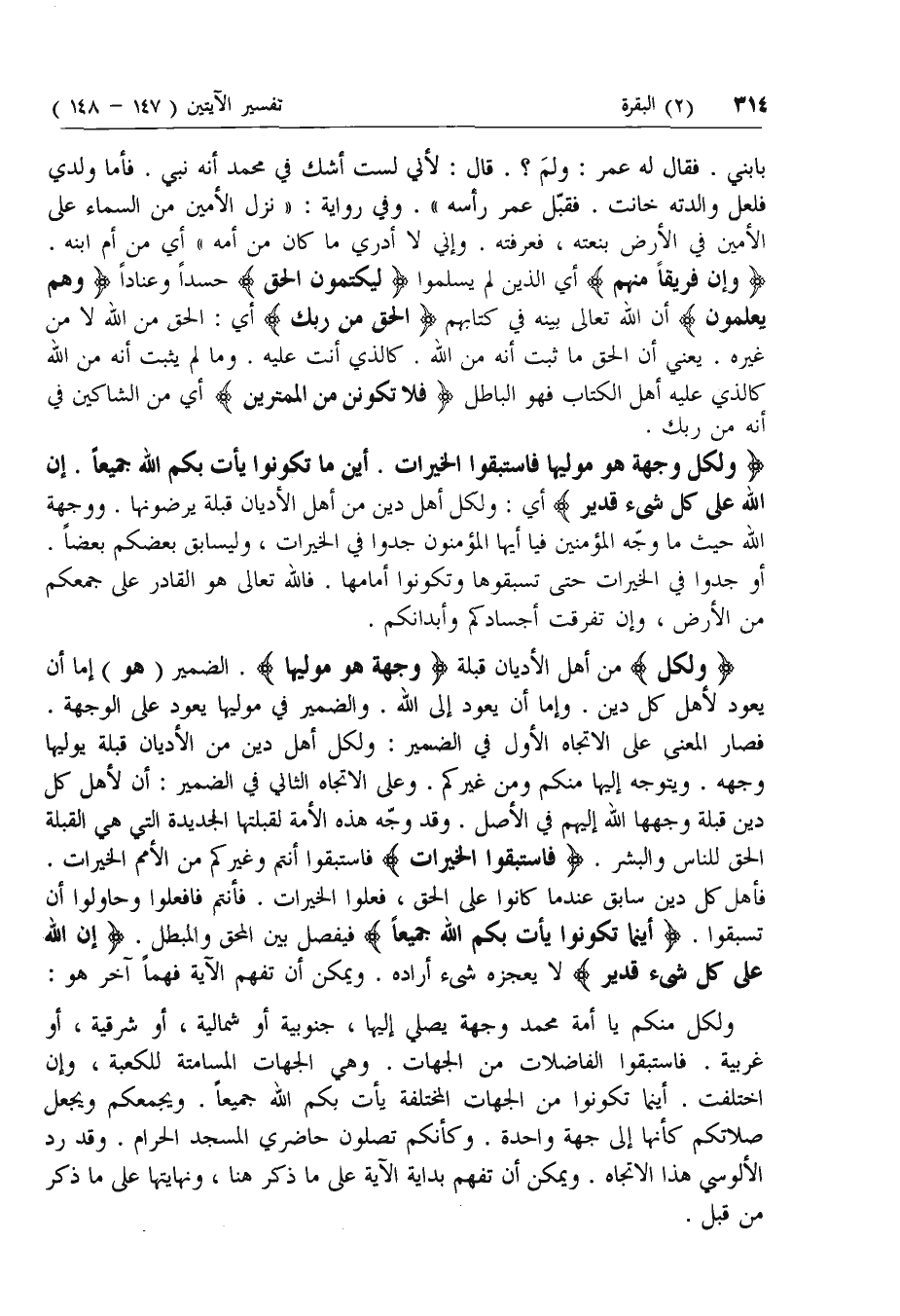 وَلِكُلٍّ وِجْهَةٌ هُوَ مُوَلِّيها فَاسْتَبِقُوا الْخَيْراتِ. أَيْنَ ما تَكُونُوا يَأْتِ بِكُمُ اللَّهُ جَمِيعاً. إِنَّ اللَّهَ عَلى كُلِّ شَيْءٍ قَدِيرٌ أي: ولكل أهل دين من أهل الأديان قبلة يرضونها. ووجهة الله حيث ما وجه المؤمنين فيا أيها المؤمنون جدوا في الخيرات، وليسابق بعضكم بعضا.