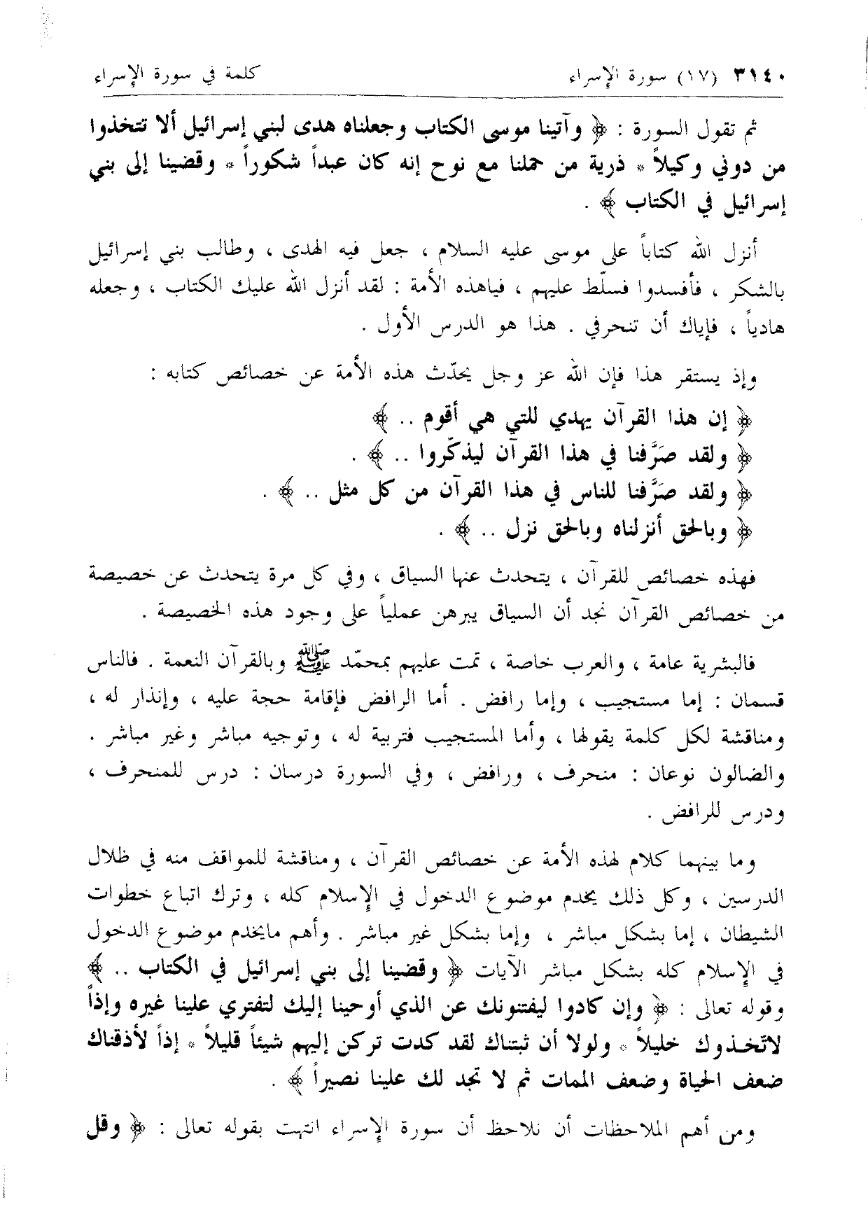 ثم تقول السورة: وَآتَيْنا مُوسَى الْكِتابَ وَجَعَلْناهُ هُدىً لِبَنِي إِسْرائِيلَ أَلَّا تَتَّخِذُوا مِنْ دُونِي وَكِيلًا* ذُرِّيَّةَ مَنْ حَمَلْنا مَعَ نُوحٍ إِنَّهُ كانَ عَبْداً شَكُوراً* وَقَضَيْنا إِلى بَنِي إِسْرائِيلَ فِي الْكِتابِ.