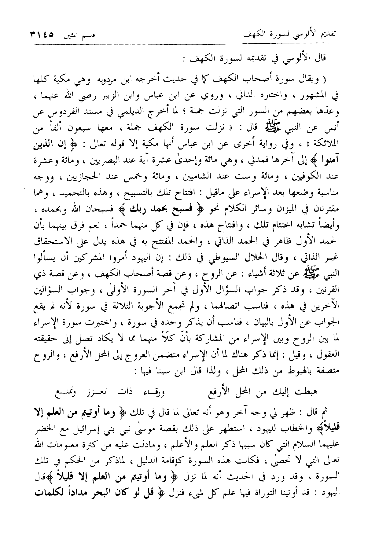 (ويقال سورة أصحاب الكهف كما في حديث أخرجه ابن مردويه وهي مكية كلها في المشهور، واختاره الداني، وروي عن ابن عباس وابن الزبير رضي الله عنهما، وعدّها بعضهم من السور التي نزلت جملة؛ لما أخرج الديلمي في مسند الفردوس عن أنس عن النبي صلّى الله عليه وسلّم قال: «نزلت سورة الكهف جملة، معها سبعون ألفا من الملائكة»، وفي رواية أخرى عن ابن عباس أنها مكية إلا قوله تعالى: إِنَّ الَّذِينَ آمَنُوا إلى آخرها فمدني، وهي مائة وإحدى عشرة آية عند البصريين، ومائة وعشرة عند الكوفيين، ومائة وست عند الشاميين، ومائة وخمس عند الحجازيين، ووجه مناسبة وضعها بعد الإسراء على ما قيل: افتتاح تلك بالتسبيح، وهذه بالتحميد، وهما مقترنان في الميزان وسائر الكلام نحو فَسَبِّحْ بِحَمْدِ رَبِّكَ* فسبحان الله وبحمده، وأيضا تشابه اختتام تلك، وافتتاح هذه، فإن في كل منهما حمدا، نعم فرق بينهما بأن الحمد الأول ظاهر في الحمد الذاتي، والحمد المفتتح به في هذه يدل على الاستحقاق غير الذاتي، وقال الجلال السيوطي في ذلك: إن اليهود أمروا المشركين أن يسألوا النبي صلّى الله عليه وسلّم عن ثلاثة أشياء: عن الروح، وعن قصة أصحاب الكهف، وعن قصة ذي القرنين، وقد ذكر جواب السؤال الأول في آخر السورة الأولى، وجواب السؤالين الآخرين في هذه، فناسب اتصالهما، ولم تجمع الأجوبة الثلاثة في سورة لأنه لم يقع الجواب عن الأول بالبيان، فناسب أن يذكر وحده في سورة، واختيرت سورة الإسراء لما بين الروح وبين الإسراء من المشاركة بأنّ كلّا منهما مما لا يكاد تصل إلى حقيقته العقول، وقيل: إنما ذكر هناك لما أن الإسراء متضمن العروج إلى المحل الأرفع، والروح متصفة بالهبوط من ذلك المحل، ولذا قال ابن سينا فيها:
