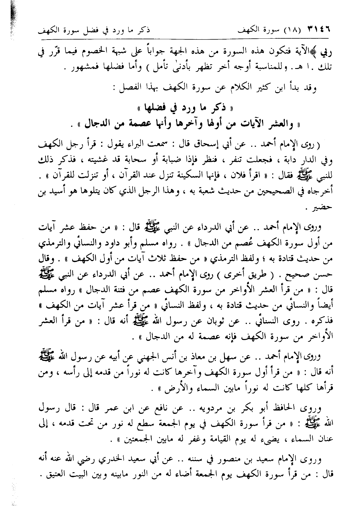 «ذكر ما ورد في فضلها» «والعشر الآيات من أولها وآخرها وأنها عصمة من الدجال».