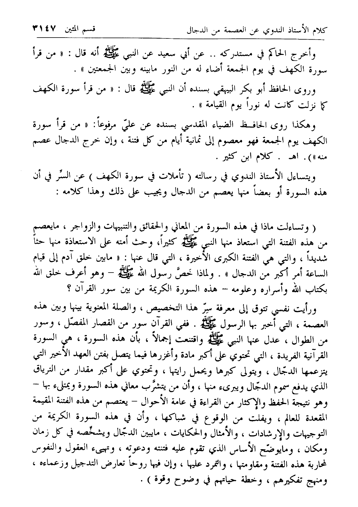 ورأيت نفسي تتوق إلى معرفة سرّ هذا التخصيص، والصلة المعنوية بينها وبين هذه العصمة، التي أخبر بها الرسول صلّى الله عليه وسلّم. ففي القرآن سور من القصار المفصّل، وسور من الطوال، عدل عنها النبي صلّى الله عليه وسلّم واقتنعت إجمالا، بأن هذه السورة، هي السورة القرآنية الفريدة، التي تحتوي على أكبر مادة وأغزرها فيما يتصل بفتن العهد الأخير التي يتزعمها الدجّال، ويتولى كبرها ويحمل رايتها، وتحتوي على أكبر مقدار من الترياق الذي يدفع سموم الدجّال ويبرئ منها، وأن من يتشرّب معاني هذه السورة ويمتلئ بها- وهو نتيجة الحفظ والإكثار من القراءة في عامة الأحوال- يعتصم من هذه الفتنة المقيمة المقعدة للعالم، ويفلت من الوقوع في شباكها، وأن في هذه السورة الكريمة من التوجيهات والإرشادات، والأمثال والحكايات، ما يبين الدجّال ويشخّصه في كل زمان ومكان، وما يوضّح الأساس الذي تقوم عليه فتنته ودعوته، وتهيئ العقول والنفوس لمحاربة هذه الفتنة ومقاومتها، والتمرد عليها، وإن فيها روحا تعارض التدجيل وزعماءه، ومنهج تفكيرهم، وخطة حياتهم في وضوح وقوة).