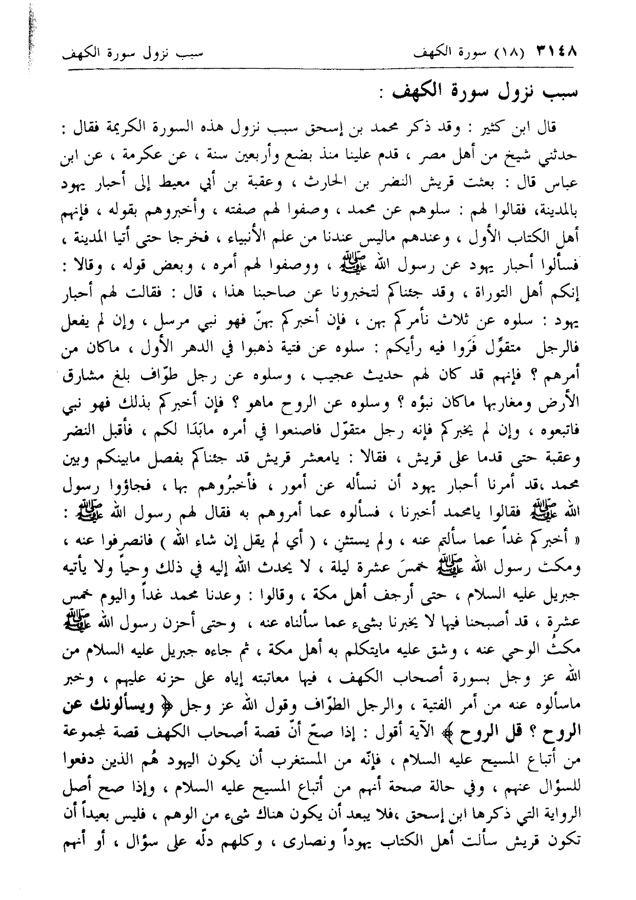إنكم أهل التوراة، وقد جئناكم لتخبرونا عن صاحبنا هذا، قال: فقالت لهم أحبار يهود: سلوه عن ثلاث نأمركم بهن، فإن أخبركم بهنّ فهو نبي مرسل، وإن لم يفعل فالرجل متقوّل فروا فيه رأيكم: سلوه عن فتية ذهبوا في الدهر الأول، ما كان من أمرهم؟ فإنهم قد كان لهم حديث عجيب، وسلوه عن رجل طوّاف بلغ مشارق الأرض ومغاربها ما كان نبؤه؟ وسلوه عن الروح ما هو؟ فإن أخبركم بذلك فهو نبي فاتبعوه، وإن لم يخبركم فإنه رجل متقوّل فاصنعوا في أمره ما بدا لكم، فأقبل النضر وعقبة حتى قدما على قريش، فقالا: يا معشر قريش قد جئناكم بفصل ما بينكم وبين محمد، قد أمرنا أحبار يهود أن نسأله عن أمور، فأخبروهم بها، فجاءوا رسول الله صلّى الله عليه وسلّم فقالوا يا محمد أخبرنا، فسألوه عما أمروهم به فقال لهم رسول الله صلّى الله عليه وسلّم: