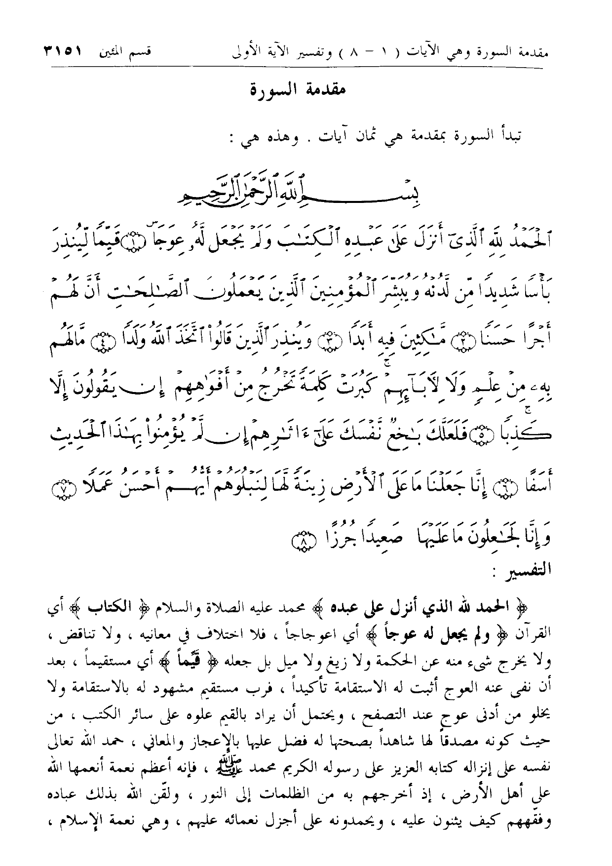 قَيِّماً أي مستقيما، بعد أن نفى عنه العوج أثبت له الاستقامة تأكيدا، فرب مستقيم مشهود له بالاستقامة ولا يخلو من أدنى عوج عند التصفح، ويحتمل أن يراد بالقيم علوه على سائر الكتب، من حيث كونه مصدقا لها شاهدا بصحتها له فضل عليها بالإعجاز والمعاني، حمد الله تعالى نفسه على إنزاله كتابه العزيز على رسوله الكريم محمد صلّى الله عليه وسلّم، فإنه أعظم نعمة أنعمها الله على أهل الأرض، إذ أخرجهم به من الظلمات إلى النور، ولقّن الله بذلك عباده وفقّههم كيف يثنون عليه، ويحمدونه على أجزل نعمائه عليهم، وهي نعمة الإسلام،