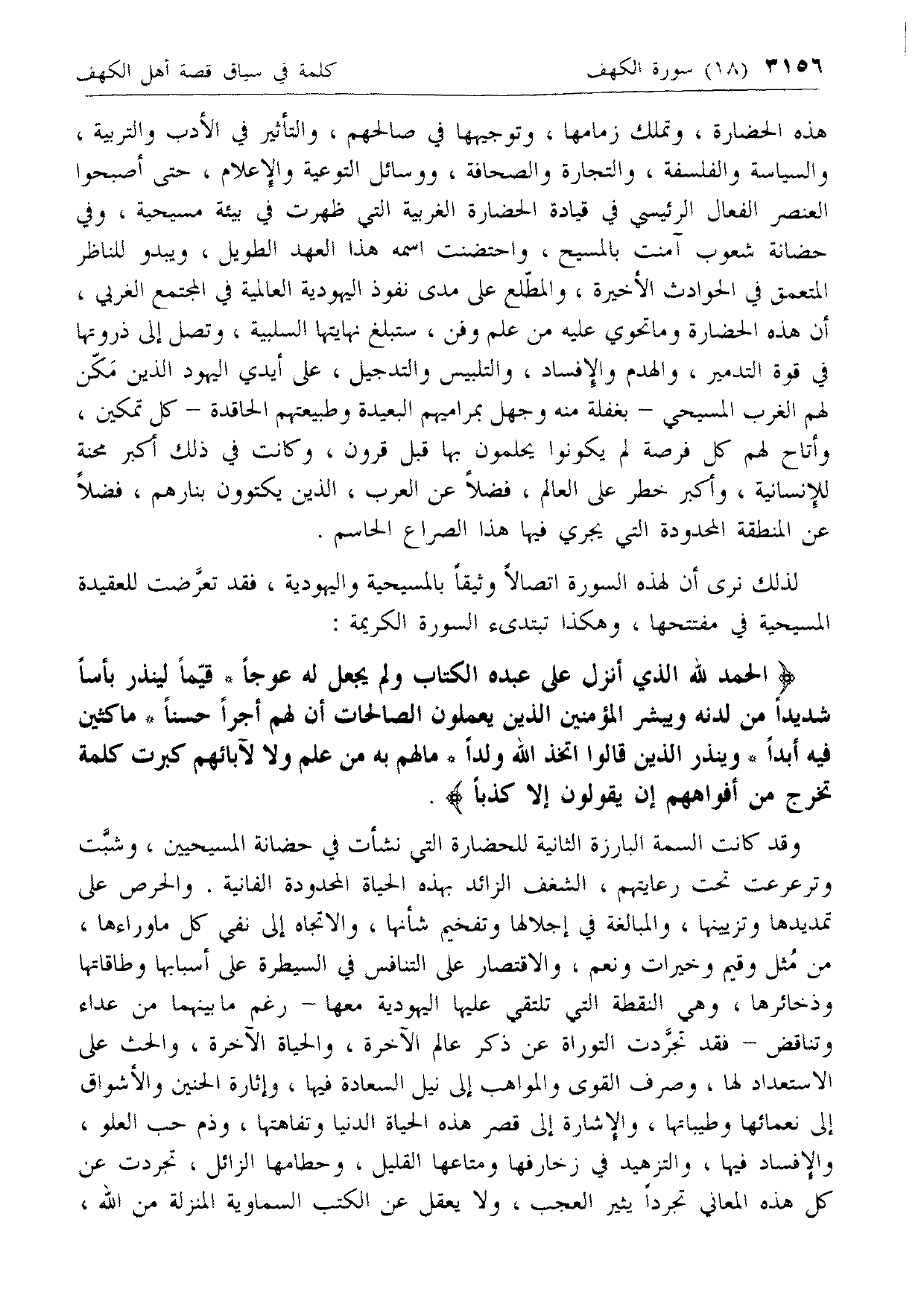 الْحَمْدُ لِلَّهِ الَّذِي أَنْزَلَ عَلى عَبْدِهِ الْكِتابَ وَلَمْ يَجْعَلْ لَهُ عِوَجاً* قَيِّماً لِيُنْذِرَ بَأْساً شَدِيداً مِنْ لَدُنْهُ وَيُبَشِّرَ الْمُؤْمِنِينَ الَّذِينَ يَعْمَلُونَ الصَّالِحاتِ أَنَّ لَهُمْ أَجْراً حَسَناً* ماكِثِينَ فِيهِ أَبَداً* وَيُنْذِرَ الَّذِينَ قالُوا اتَّخَذَ اللَّهُ وَلَداً* ما لَهُمْ بِهِ مِنْ عِلْمٍ وَلا لِآبائِهِمْ كَبُرَتْ كَلِمَةً تَخْرُجُ مِنْ أَفْواهِهِمْ إِنْ يَقُولُونَ إِلَّا كَذِباً.
