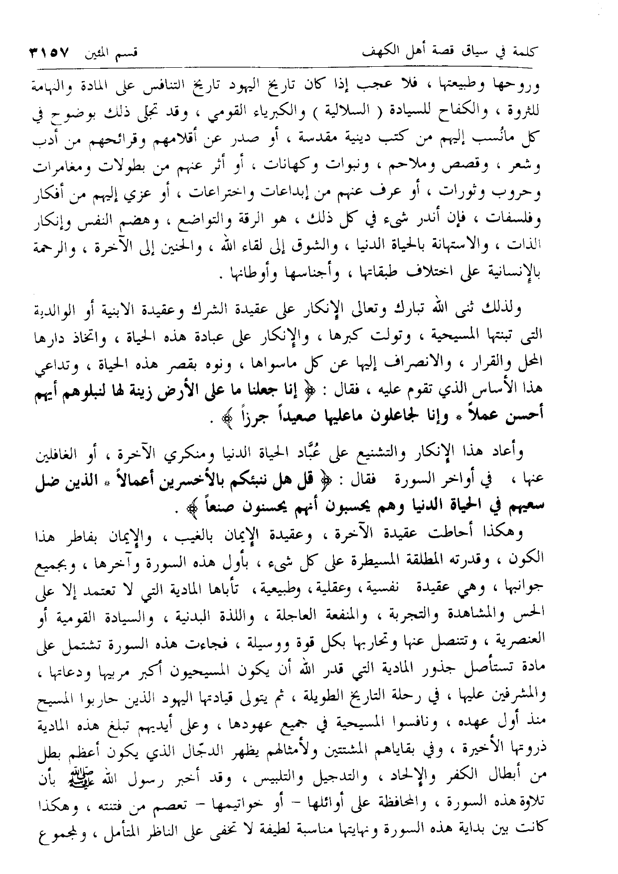 وهكذا أحاطت عقيدة الآخرة، وعقيدة الإيمان بالغيب، والإيمان بفاطر هذا الكون، وقدرته المطلقة المسيطرة على كل شئ، بأول هذه السورة وآخرها، وبجميع جوانبها، وهي عقيدة نفسية، وعقلية، وطبيعية، تأباها المادية التي لا تعتمد إلا على الحس والمشاهدة والتجربة، والمنفعة العاجلة، واللذة البدنية، والسيادة القومية أو العنصرية، وتتنصل عنها وتحاربها بكل قوة ووسيلة، فجاءت هذه السورة تشتمل على مادة تستأصل جذور المادية التي قدر الله أن يكون المسيحيون أكبر مربيها ودعاتها، والمشرفين عليها، في رحلة التاريخ الطويلة، ثم يتولى قيادتها اليهود الذين حاربوا المسيح منذ أول عهده، ونافسوا المسيحية في جميع عهودها، وعلى أيديهم تبلغ هذه المادية ذروتها الأخيرة، وفي بقاياهم المشتتين ولأمثالهم يظهر الدجّال الذي يكون أعظم بطل من أبطال الكفر والإلحاد، والتدجيل والتلبيس، وقد أخبر رسول الله صلّى الله عليه وسلّم بأن تلاوة هذه السورة، والمحافظة على أوائلها- أو خواتيمها- تعصم من فتنته، وهكذا كانت بين بداية هذه السورة ونهايتها مناسبة لطيفة لا تخفى على الناظر المتأمل، ولمجموع
