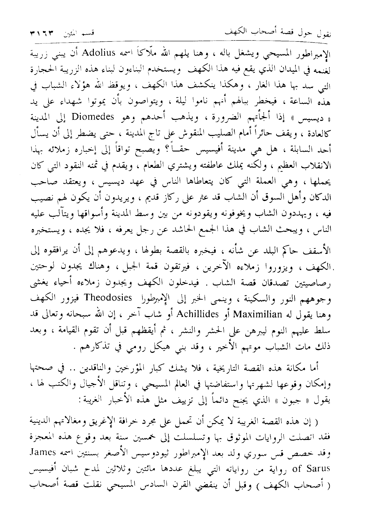الإمبراطور المسيحي ويشغل باله، وهنا يلهم الله ملّاكا اسمه Adolius أن يبني زربية لغنمه في الميدان الذي يقع فيه هذا الكهف ويستخدم البناءون لبناء هذه الزريبة الحجارة التي سد بها هذا الغار، وهكذا ينكشف هذا الكهف، ويوقظ الله هؤلاء الشباب في هذه الساعة، فيخطر ببالهم أنهم ناموا ليلة، ويتواصون بأن يموتوا شهداء على يد «ديسيس» إذا ألجأتهم الضرورة، ويذهب أحدهم وهو Diomedes إلى المدينة كالعادة، ويقف حائرا أمام الصليب المنقوش على تاج المدينة، حتى يضطر إلى أن يسأل أحد السابلة، هل هي مدينة أفيسيس حقا؟ ويصبح تواقا إلى إخباره زملائه بهذا الانقلاب العظيم، ولكنه يملك عاطفته ويشتري الطعام، ويقدم في ثمنه النقود التي كان يحملها، وهي العملة التي كان يتعاطاها الناس في عهد ديسيس، ويعتقد صاحب الدكان وأهل السوق أن الشاب قد عثر على ركاز قديم، ويريدون أن يكون لهم نصيب فيه، ويهددون الشاب ويخوفونه ويقودونه من بين وسط المدينة وأسواقها ويتآلب عليه الناس، ويبحث الشاب في هذا الجمع الحاشد عن رجل يعرفه، فلا يجده، ويستخبره الأسقف حاكم البلد عن شأنه، فيخبره بالقصة بطولها، ويدعوهم إلى أن يرافقوه إلى الكهف، ويزوروا زملاءه الآخرين، فيرتقون قمة الجبل، وهناك يجدون لوحتين رصاصيتين تصدقان قصة الشاب. فيدخلون الكهف ويجدون زملاءه أحياء يغشى وجوههم النور والسكينة، وينمى الخبر إلى الإمبراطورا Theodosies فيزور الكهف وهنا يقول له Maximilian أو Achillides أو شاب آخر، إن الله سبحانه وتعالى قد سلط عليهم النوم ليبرهن على الحشر والنشر، ثم أيقظهم قبل أن تقوم القيامة، وبعد ذلك مات الشباب موتهم الأخير، وقد بني هيكل رومي في تذكارهم.