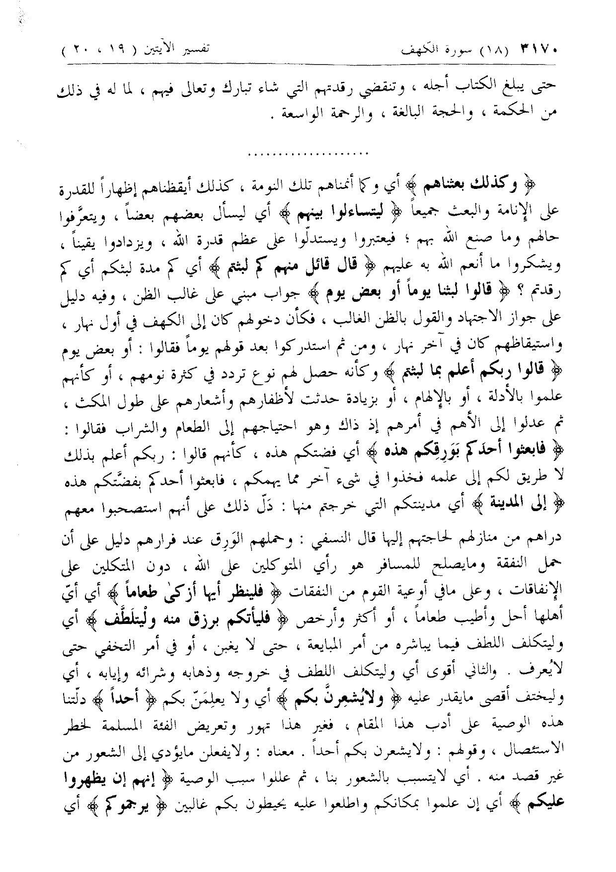وَكَذلِكَ بَعَثْناهُمْ أي وكما أنمناهم تلك النومة، كذلك أيقظناهم إظهارا للقدرة على الإنامة والبعث جميعا لِيَتَساءَلُوا بَيْنَهُمْ أي ليسأل بعضهم بعضا، ويتعرّفوا حالهم وما صنع الله بهم؛ فيعتبروا ويستدلّوا على عظم قدرة الله، ويزدادوا يقينا، ويشكروا ما أنعم الله به عليهم قالَ قائِلٌ مِنْهُمْ كَمْ لَبِثْتُمْ أي كم مدة لبثكم أي كم رقدتم؟ قالُوا لَبِثْنا يَوْماً أَوْ بَعْضَ يَوْمٍ جواب مبني على غالب الظن، وفيه دليل على جواز الاجتهاد والقول بالظن الغالب، فكأن دخولهم كان إلى الكهف في أول نهار، واستيقاظهم كان في آخر نهار، ومن ثم استدركوا بعد قولهم يوما فقالوا: أو بعض يوم قالُوا رَبُّكُمْ أَعْلَمُ بِما لَبِثْتُمْ وكأنه حصل لهم نوع تردد في كثرة نومهم، أو كأنهم علموا بالأدلة، أو بالإلهام، أو بزيادة حدثت لأظفارهم وأشعارهم على طول المكث، ثم عدلوا إلى الأهم في أمرهم إذ ذاك وهو احتياجهم إلى الطعام والشراب فقالوا: