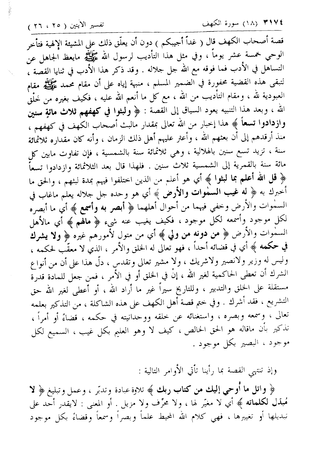 قُلِ اللَّهُ أَعْلَمُ بِما لَبِثُوا أي هو أعلم من الذين اختلفوا فيهم بمدة لبثهم، والحق ما أخبرك به لَهُ غَيْبُ السَّماواتِ وَالْأَرْضِ أي هو وحده جل جلاله يعلم ما غاب في السموات والأرض وخفي فيهما من أحوال أهلهما أَبْصِرْ بِهِ وَأَسْمِعْ أي ما أبصره لكل موجود وأسمعه لكل موجود، فكيف يغيب عنه شيء ما لَهُمْ أي ما لأهل السموات والأرض مِنْ دُونِهِ مِنْ وَلِيٍّ أي من متول لأمورهم غيره وَلا يُشْرِكُ فِي حُكْمِهِ أي في قضائه أحدا، فهو تعالى له الخلق والأمر، الذي لا معقّب لحكمه، وليس له وزير ولا نصير ولا شريك، ولا مشير تعالى وتقدس، دلّ هذا على أن من أنواع الشرك أن تعطى الحاكمية لغير الله، إن في الخلق أو في الأمر، فمن جعل للمادة قدرة مستقلة على الخلق والتدبير، وللتاريخ سيرا غير ما أراد الله، أو أعطى لغير الله حق التشريع، فقد أشرك. وفي ختم قصة أهل الكهف على هذه الشاكلة، من التذكير بعلمه تعالى، وسمعه وبصره، واستغنائه عن خلقه ووحدانيته في حكمه، قضاء أو أمرا، تذكير بأن ما قاله هو الحق الخالص، كيف لا وهو العليم بكل غيب، السميع لكل موجود، البصير بكل موجود.