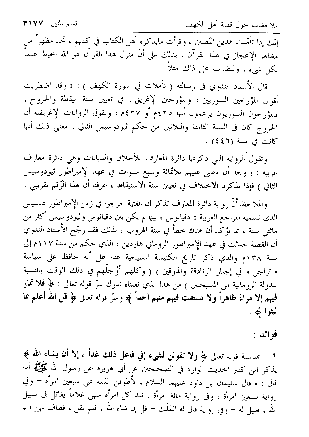والملاحظ أنّ رواية دائرة المعارف تذكر أن الفتية خرجوا في زمن الإمبراطور ديسيس الذي تسميه المراجع العربية «دقيانوس» بينما لم يكن بين دقيانوس وثيودوسيس أكثر من مائتي سنة، مما يؤكد أن هناك خطأ في سنة الهروب، لذلك فقد رجّح الأستاذ الندوي أن القصة حدثت في عهد الإمبراطور الروماني هاردين، الذي حكم من سنة 117 م إلى سنة 138 م والذي ذكر تاريخ الكنيسة المسيحية عنه على أنه حافظ على سياسة «تراجن» في إجبار الزنادقة والمارقين) (وكلهم أو جلّهم في ذلك الوقت بالنسبة للدولة الرومانية من المسيحيين) من هذا الذي نقلناه ندرك سرّ قوله تعالى: فَلا تُمارِ فِيهِمْ إِلَّا مِراءً ظاهِراً وَلا تَسْتَفْتِ فِيهِمْ مِنْهُمْ أَحَداً وسرّ قوله تعالى قُلِ اللَّهُ أَعْلَمُ بِما لَبِثُوا.