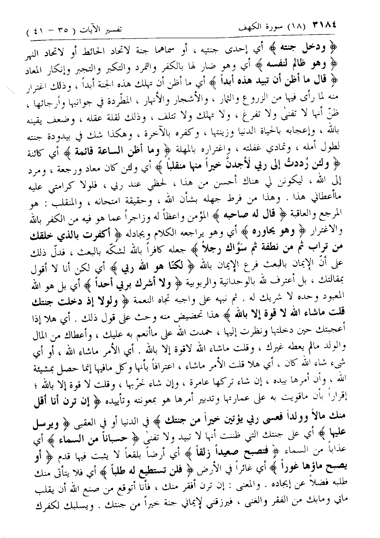 ثم نبهه على واجبه تجاه النعمة وَلَوْلا إِذْ دَخَلْتَ جَنَّتَكَ قُلْتَ ما شاءَ اللَّهُ لا قُوَّةَ إِلَّا بِاللَّهِ هذا تحضيض منه وحث على قول ذلك. أي هلا إذا أعجبتك حين دخلتها ونظرت إليها، حمدت الله على ما أنعم به عليك، وأعطاك من المال والولد ما لم يعطه غيرك، وقلت ما شاء الله لا قوة إلا بالله. أي الأمر ما شاء الله، أو أي شئ شاء الله كان، أي هلا قلت الأمر ما شاء، اعترافا بأنها وكل ما فيها إنما حصل بمشيئة الله، وأن أمرها بيده، إن شاء تركها عامرة، وإن شاء خرّبها، وقلت لا قوة إلا بالله؛ إقرارا بأن ما قويت به على عمارتها وتدبير أمرها هو بمعونته وتأييده إِنْ تَرَنِ أَنَا أَقَلَّ مِنْكَ مالًا وَوَلَداً