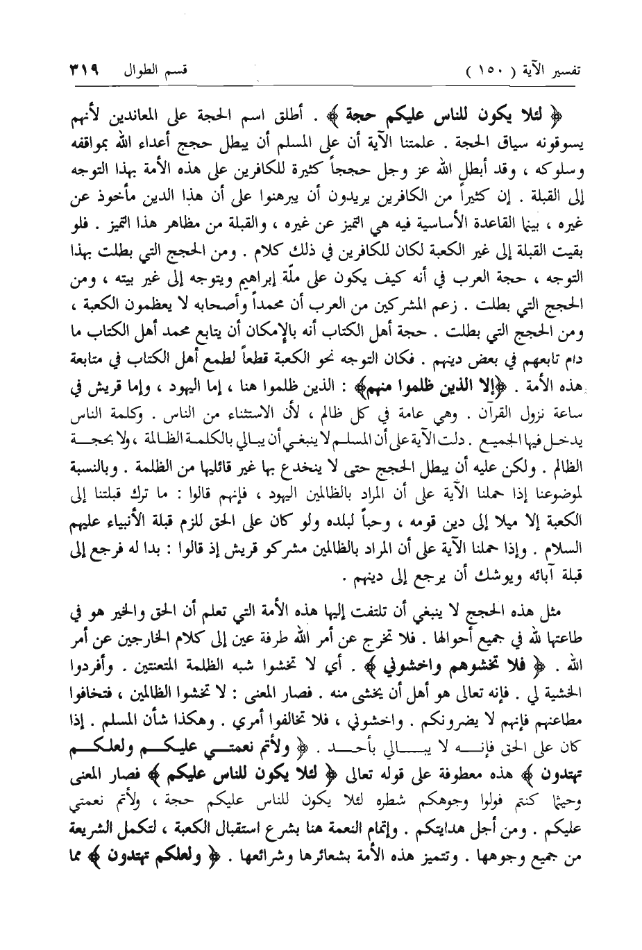لِئَلَّا يَكُونَ لِلنَّاسِ عَلَيْكُمْ حُجَّةٌ. أطلق اسم الحجة على المعاندين لأنهم يسوقونه سياق الحجة. علمتنا الآية أن على المسلم أن يبطل حجج أعداء الله بمواقفه وسلوكه، وقد أبطل الله عزّ وجل حججا كثيرة للكافرين على هذه الأمة بهذا التوجه إلى القبلة. إن كثيرا من الكافرين يريدون أن يبرهنوا على أن هذا الدين مأخوذ عن غيره، بينما القاعدة الأساسية فيه هي التميز عن غيره، والقبلة من مظاهر هذا التمييز. فلو بقيت القبلة إلى غير الكعبة لكان للكافرين في ذلك كلام. ومن الحجج التي بطلت بهذا التوجه، حجة العرب في أنه كيف يكون على ملة إبراهيم ويتوجه إلى غير بيته، ومن الحجج التي بطلت. زعم المشركين من العرب أن محمدا وأصحابه لا يعظمون الكعبة، ومن الحجج التي بطلت. حجة أهل الكتاب أنه بالإمكان أن يتابع محمد أهل الكتاب ما دام تابعهم في بعض دينهم. فكان التوجه نحو الكعبة قطعا لطمع أهل الكتاب في متابعة هذه الأمة. إِلَّا الَّذِينَ ظَلَمُوا مِنْهُمْ: الذين ظلموا هنا، إما اليهود، وإما قريش في ساعة نزول القرآن. وهي عامة في كل ظالم، لأن الاستثناء من الناس. وكلمة الناس يدخل فيها الجميع. دلت الآية على أن المسلم لا ينبغي أن يبالي بالكلمة الظالمة، ولا بحجة الظالم. ولكن عليه أن يبطل الحجج حتى لا ينخدع بها غير قائليها من الظلمة. وبالنسبة لموضوعنا إذا حملنا الآية على أن المراد بالظالمين اليهود، فإنهم قالوا: ما ترك قبلتنا إلى الكعبة إلا ميلا إلى دين قومه، وحبا لبلده ولو كان على الحق للزم قبلة الأنبياء عليهم السلام. وإذا حملنا الآية على أن المراد بالظالمين مشركو قريش إذ قالوا: بدا له فرجع إلى قبلة آبائه ويوشك أن يرجع إلى دينهم.