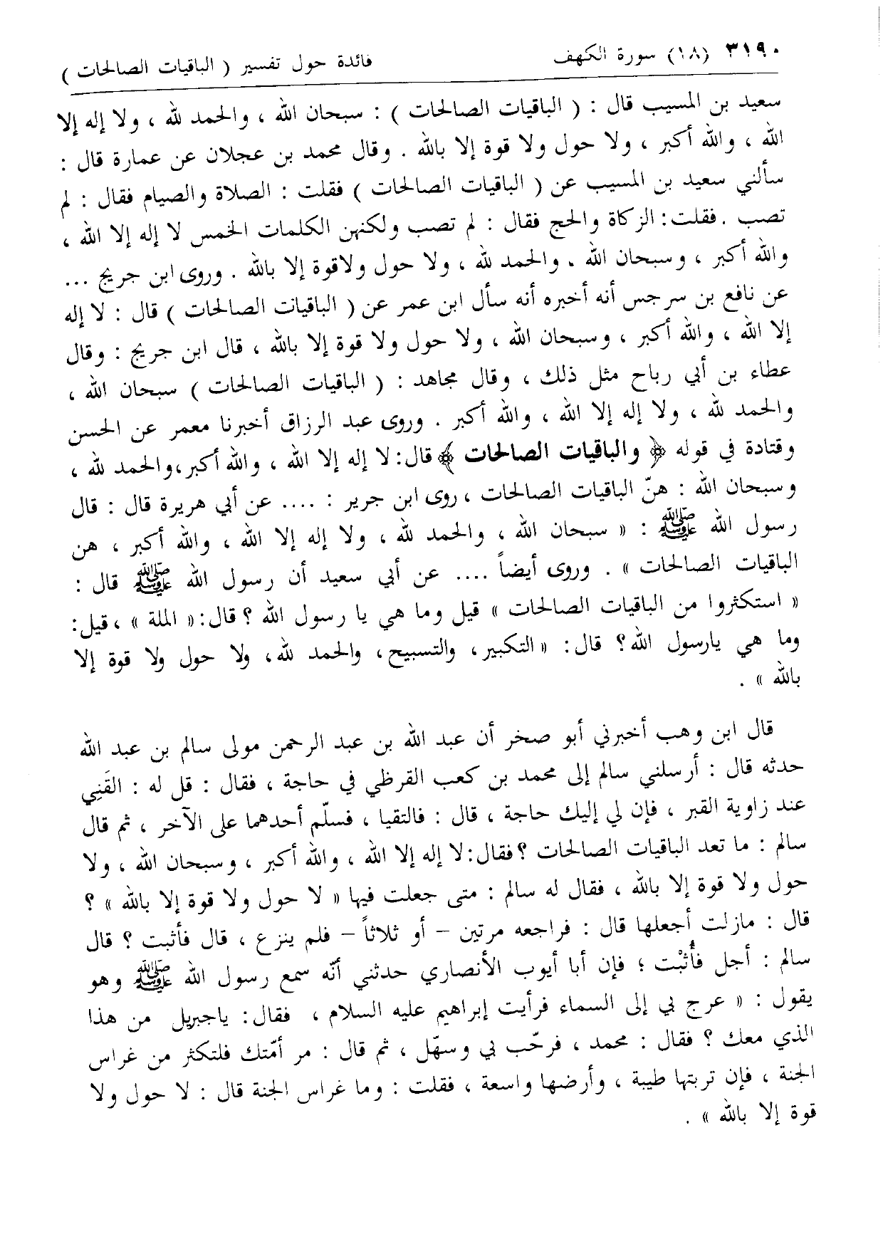 سألني سعيد بن المسيب عن (الباقيات الصالحات) فقلت: الصلاة والصيام فقال: لم تصب. فقلت: الزكاة والحج فقال: لم تصب ولكنهن الكلمات الخمس لا إله إلا الله، والله أكبر، وسبحان الله، والحمد لله، ولا حول ولا قوة إلا بالله. وروى ابن جريج ...
