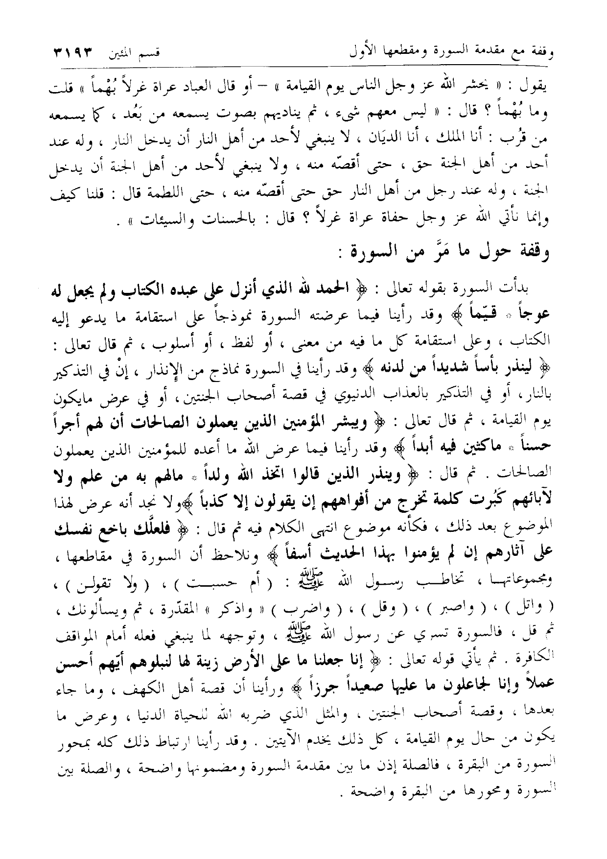 ومجموعاتها، تخاطب رسول الله صلّى الله عليه وسلّم: (أَمْ حَسِبْتَ)، (وَلا تَقُولَنَّ)، (وَاتْلُ)، (وَاصْبِرْ)، (وَقُلْ) *، (وَاضْرِبْ) * «واذكر» المقدّرة، ثم ويسألونك، ثم قل، فالسورة تسري عن رسول الله صلّى الله عليه وسلّم، وتوجهه لما ينبغي فعله أمام المواقف الكافرة. ثم يأتي قوله تعالى: إِنَّا جَعَلْنا ما عَلَى الْأَرْضِ زِينَةً لَها لِنَبْلُوَهُمْ أَيُّهُمْ أَحْسَنُ عَمَلًا وَإِنَّا لَجاعِلُونَ ما عَلَيْها صَعِيداً جُرُزاً ورأينا أن قصة أهل الكهف، وما جاء بعدها، وقصة أصحاب الجنتين، والمثل الذي ضربه الله للحياة الدنيا، وعرض ما يكون من حال يوم القيامة، كل ذلك يخدم الآيتين. وقد رأينا ارتباط ذلك كله بمحور السورة من البقرة، فالصلة إذن ما بين مقدمة السورة ومضمونها واضحة، والصلة بين السورة ومحورها من البقرة واضحة.